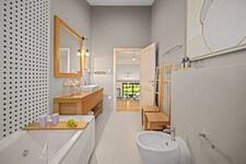 Badewanne mit Whirlpool, Waschbecken, Spiegel, Bidet