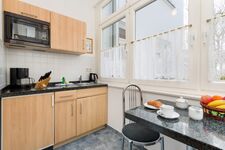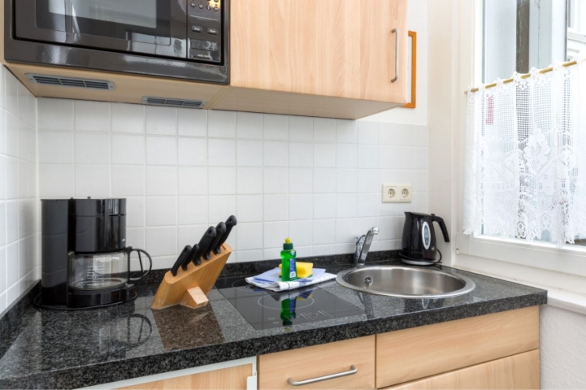 komplett ausgestattete Küchenzeile im geschlossenen Balkon mit 2-Platten-Cerankochfeld, Mikrowelle, Kühlschrank mit Eisfach, Wasserkocher, Kaffeemaschine und Toaster