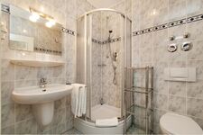 sehr schönes Bad mit WC, Dusche und fest installiertem Fön