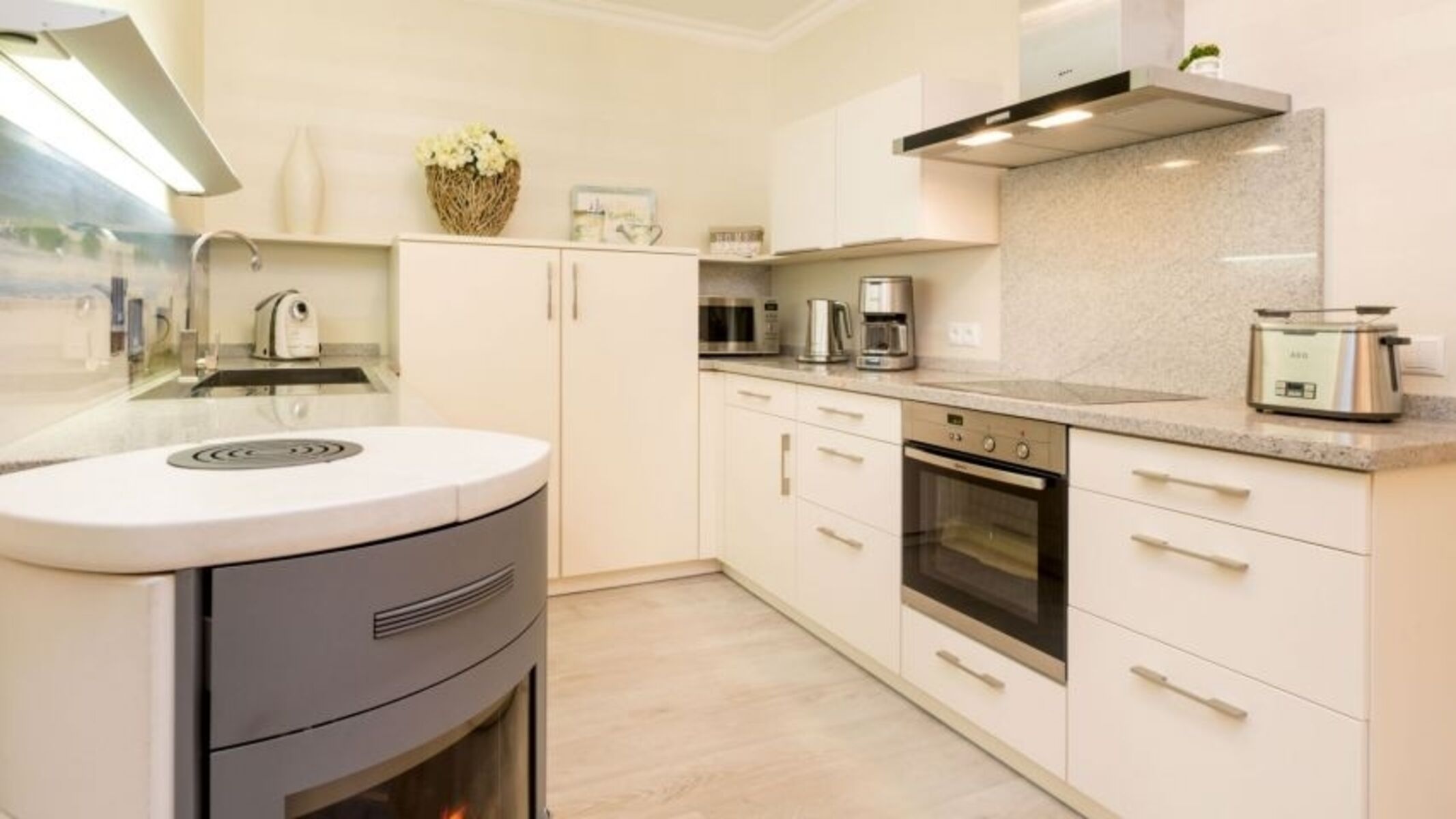 Das Wohn-/Esszimmer ist lichtdurchflutet. Es verfügt u. a. über ein Flachbild-TV, Stereoanlage, mit kostenloser Internet-Flat, DVD-Player, Essgruppe für 4 Personen, eine hochwertige Schlafcouch mit Lattenrost, einen (Bio-Ethanol-)Kamin, eine komplett ausgestattete Alno-Küche (mit Geschirrspüler, Cerankochfeld, Hochbaubackofen, Mikrowelle, Toaster, Wasserkocher etc.) u. v. m....