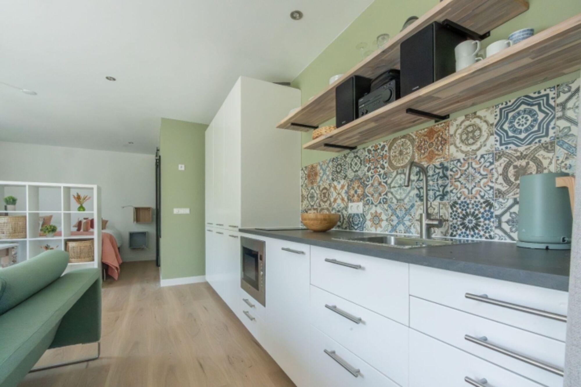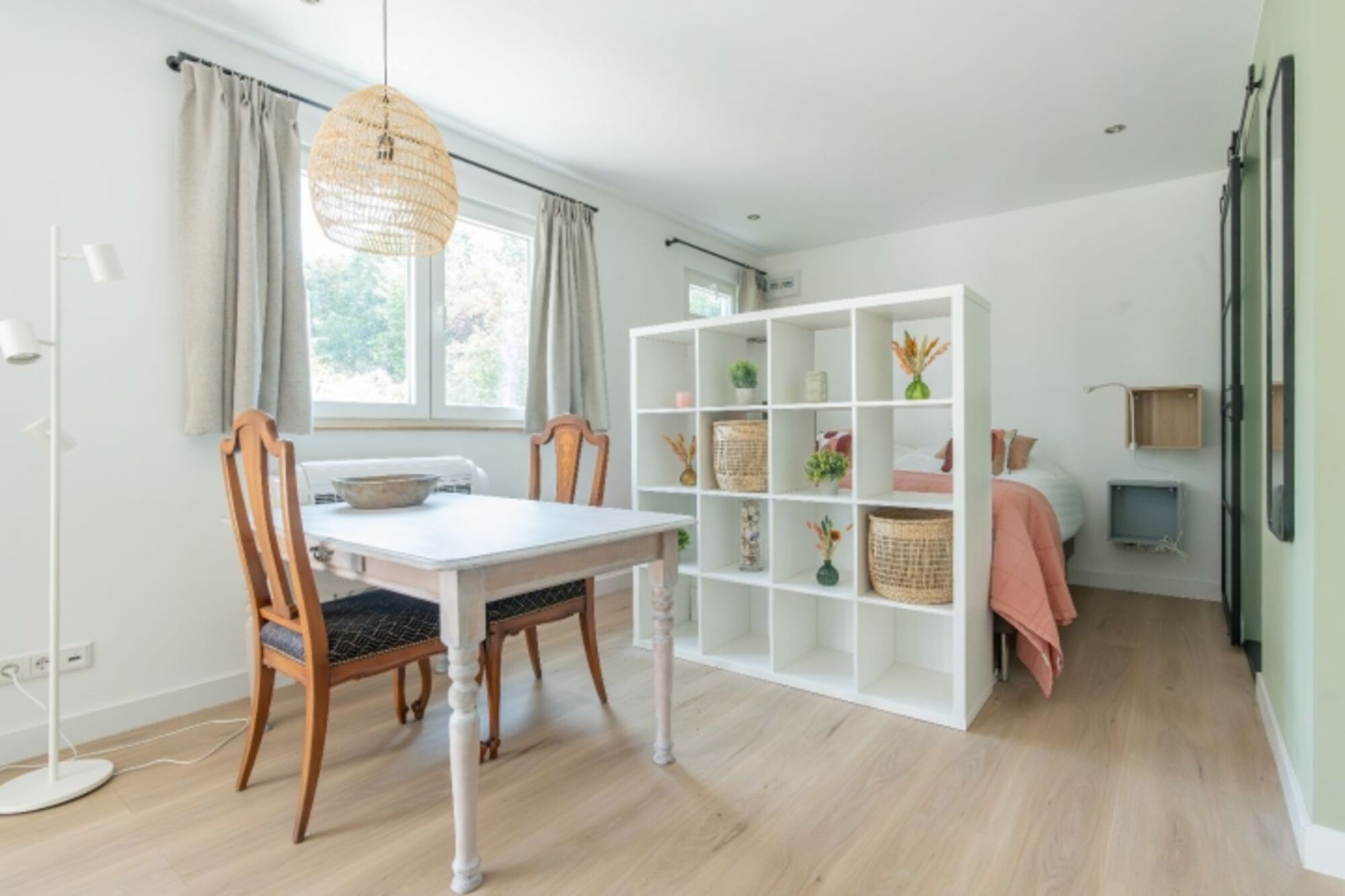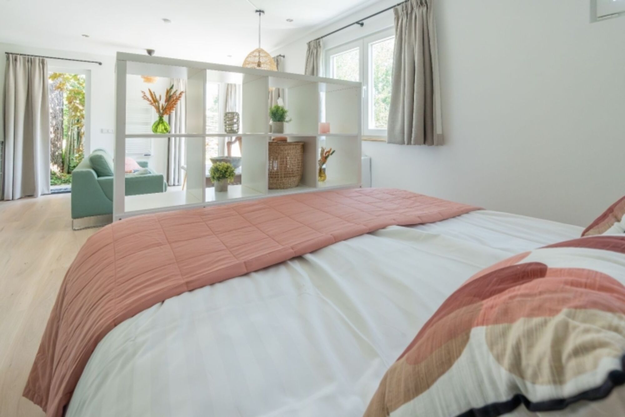Der Schlafbereich ist durch einen Raumteiler vom Wohnzimmer getrennt. Hier sorgt ein wunderbares Doppel-Boxspringbett für eine perfekte Nachtruhe. Das Studio verfügt über ausreichend Stauraum.
