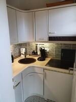 Cerankochfeld, Kühlschrank mit Gefrierfach, Gefrierschrank, Senseo-Kaffeeautomat, Korkenzieher / Flaschenöffner, Gewürze (Salz, Pfeffer, Zucker), Mülltüten