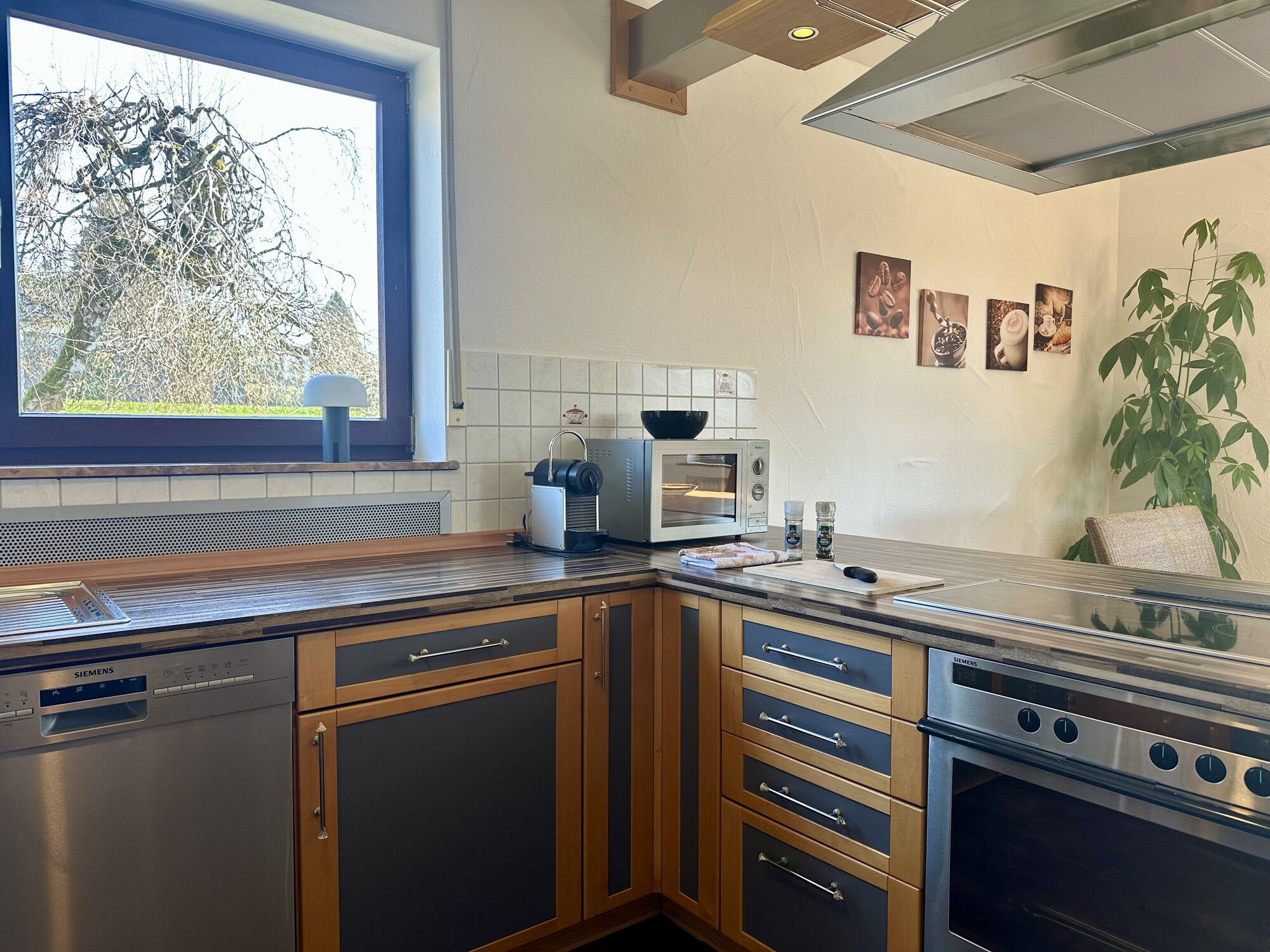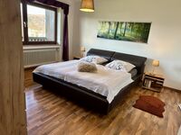 Die Ferienwohnung mit ihren 110 qm verfügt über eine absolut vollausgestattete Küche, Wohnzimmer mit Balkon, Sitzgelegenheiten, Fernblick und Abendsonne. Esszimmer mit Blick auf die Hundeeinzaeunung, Bad mit Badewanne und Dusche, Schlafzimmer mit Doppelbett und Blick zum Balkon. Weiteres Schlafzimmer mit zwei Einzelbetten (90 x 2,00 ).