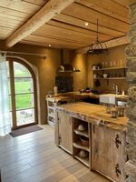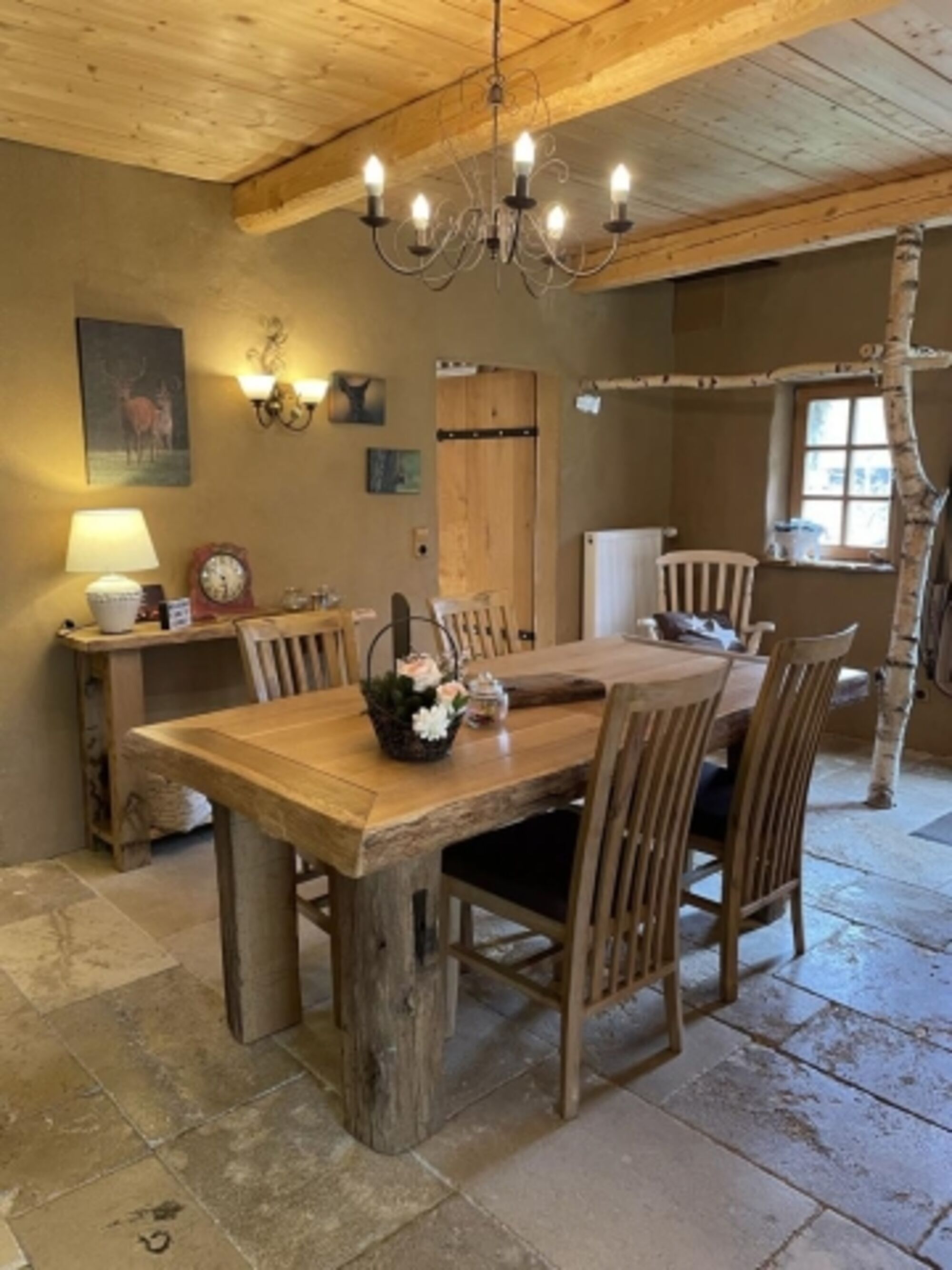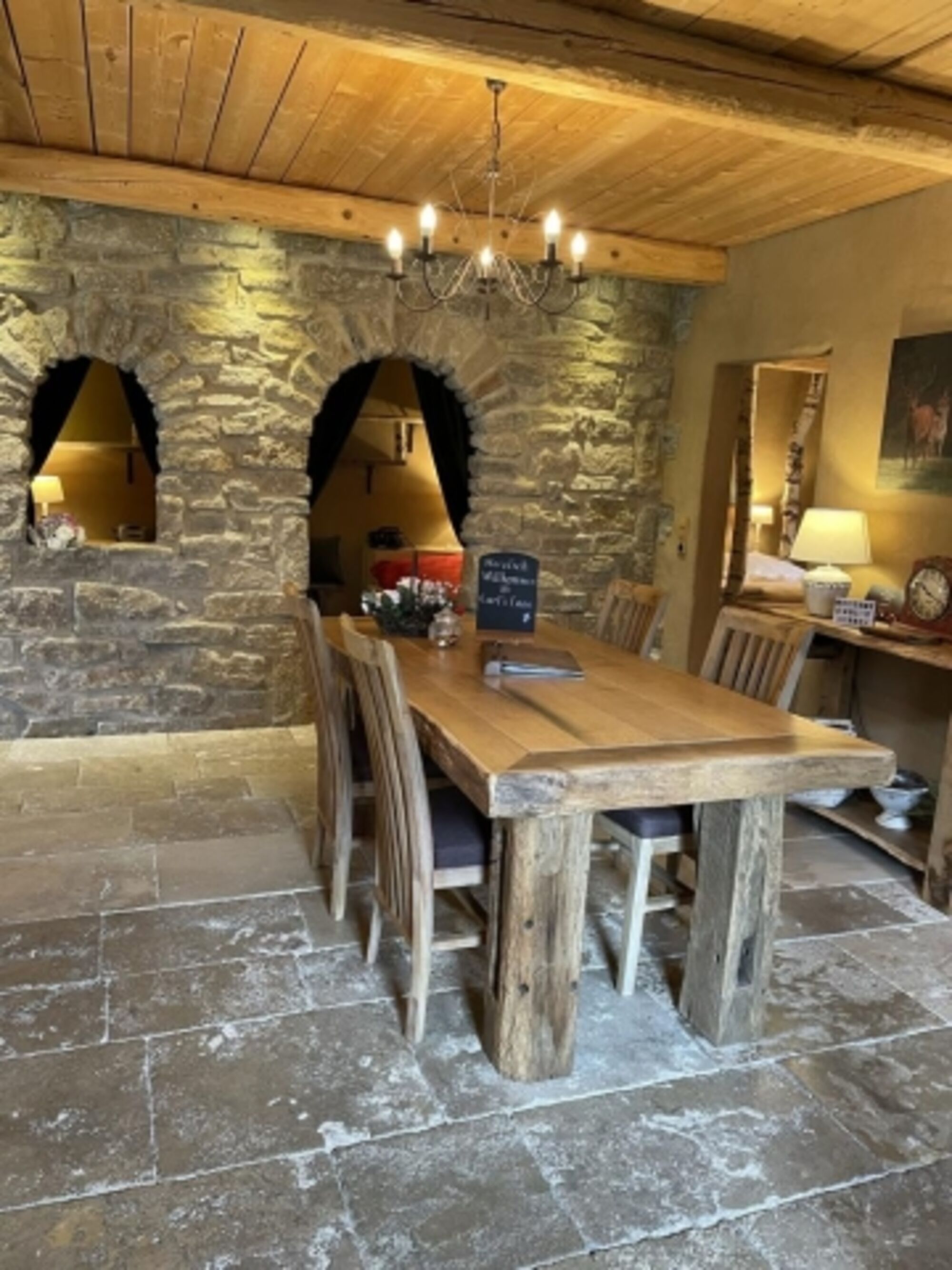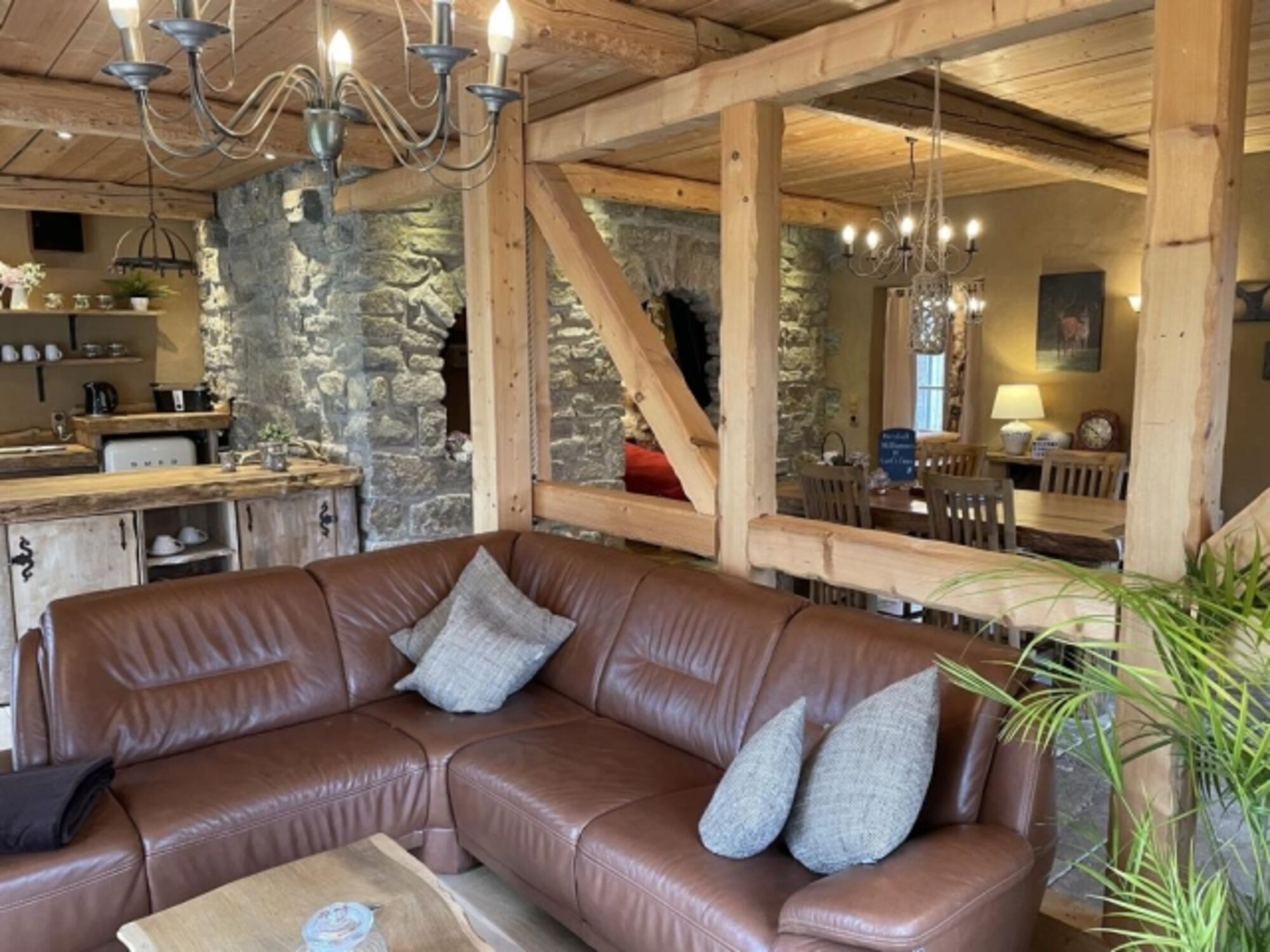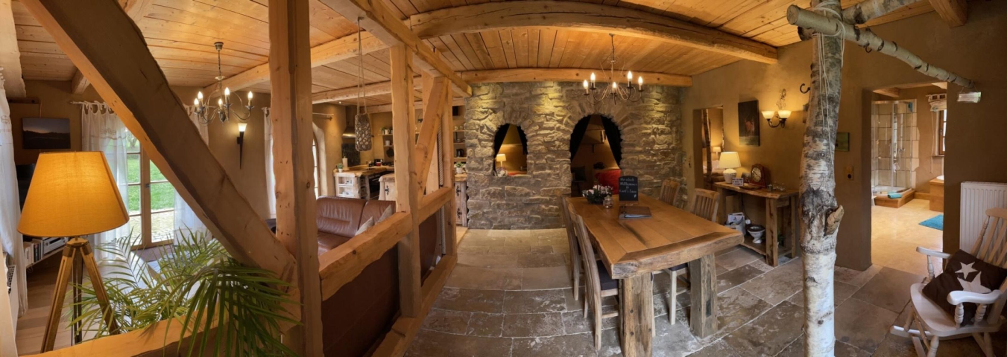 Die rustikal gemütliche Wohnung mit Naturstein, Holz und Lehm bietet auf 90m² alle Annehmlichkeiten für 2-4 Personen. Der offene Wohn-, Koch- und Essbereich ist gemütlich und komfortabel eingerichtet. Die einladende Diele mit großem Esstisch bietet viel Platz für ein gemütliches Dinner oder spannende Spieleabende.