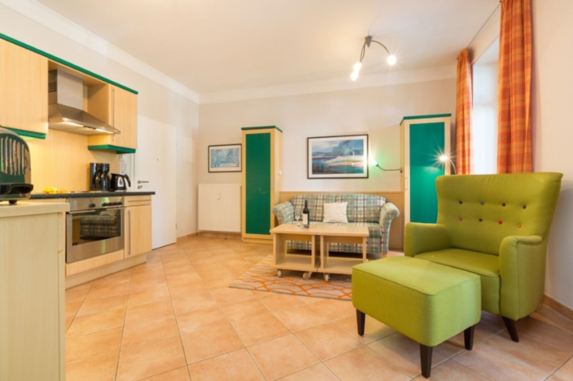 Schönes Wohnzimmer mit Küchenzeile, Flat-TV, Hifi-Anlage und Couch mit Schlaffunktion für 2 Kinder oder 1 erwachsene Person. Dem Wohnzimmer vorgelagert ist ein möblierter Wintergarten mit großem Eßtisch. Im Appartment ist ein WLAN-Anschluß kostenfrei verfügbar.