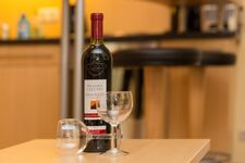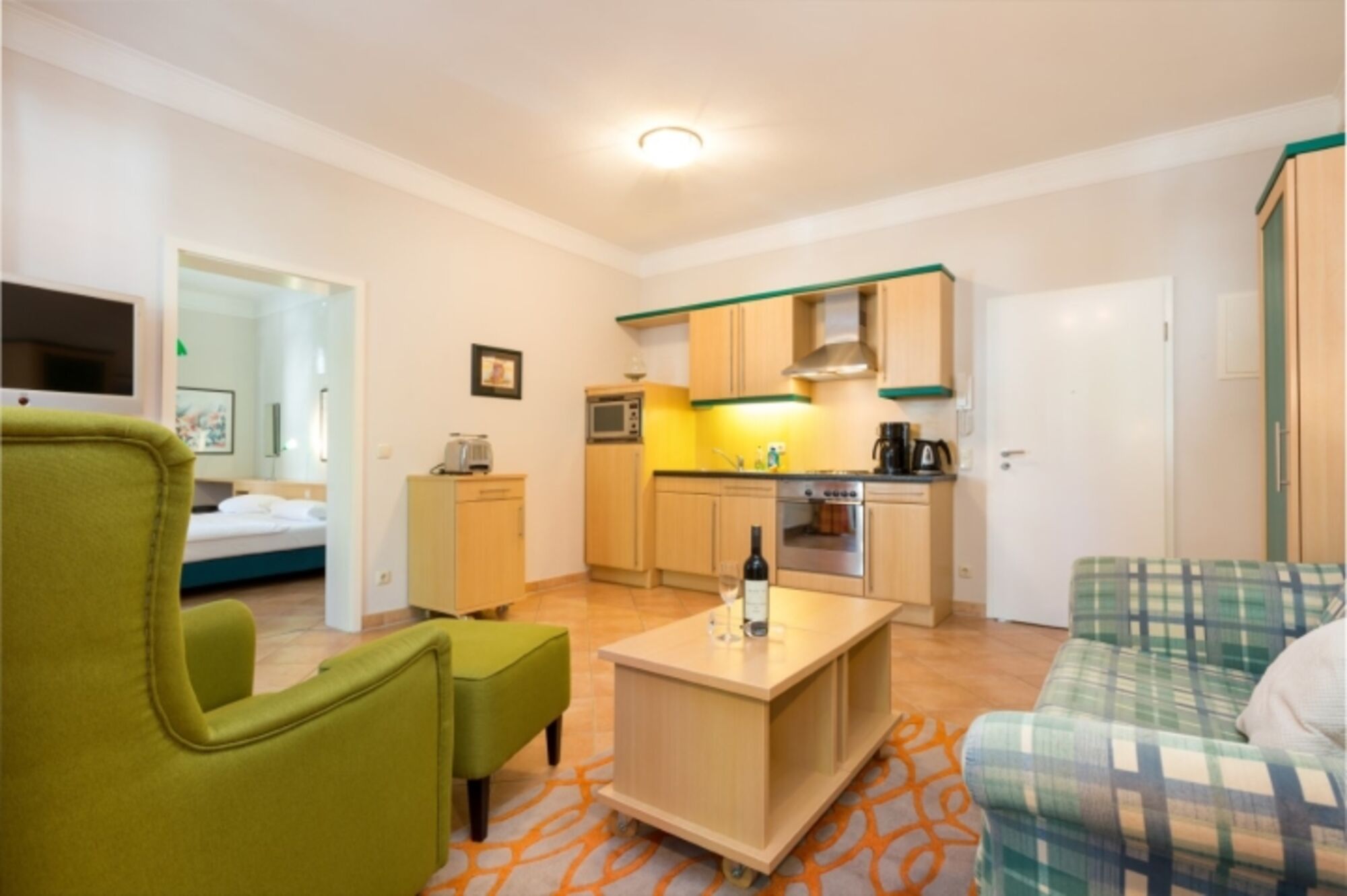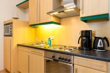 Die Küchenzeile besteht aus 4-Kochplattenherd, Dunstabzugshaube, Backofen, Kühlschrank mit Eisfach, Mikrowelle, Geschirrspüler, Kaffeemaschine, Toaster und Wasserkocher.