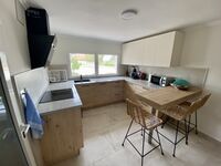 4-Platten Herd, Cerankochfeld, Dunstabzugshaube, Kühlschrank mit Gefrierfach, Gefrierschrank, Mixer, Korkenzieher / Flaschenöffner, Gewürze (Salz, Pfeffer, Zucker), Öl / Essig, Geschirrhandtücher, Mülltüten, Essplatz in der Küche