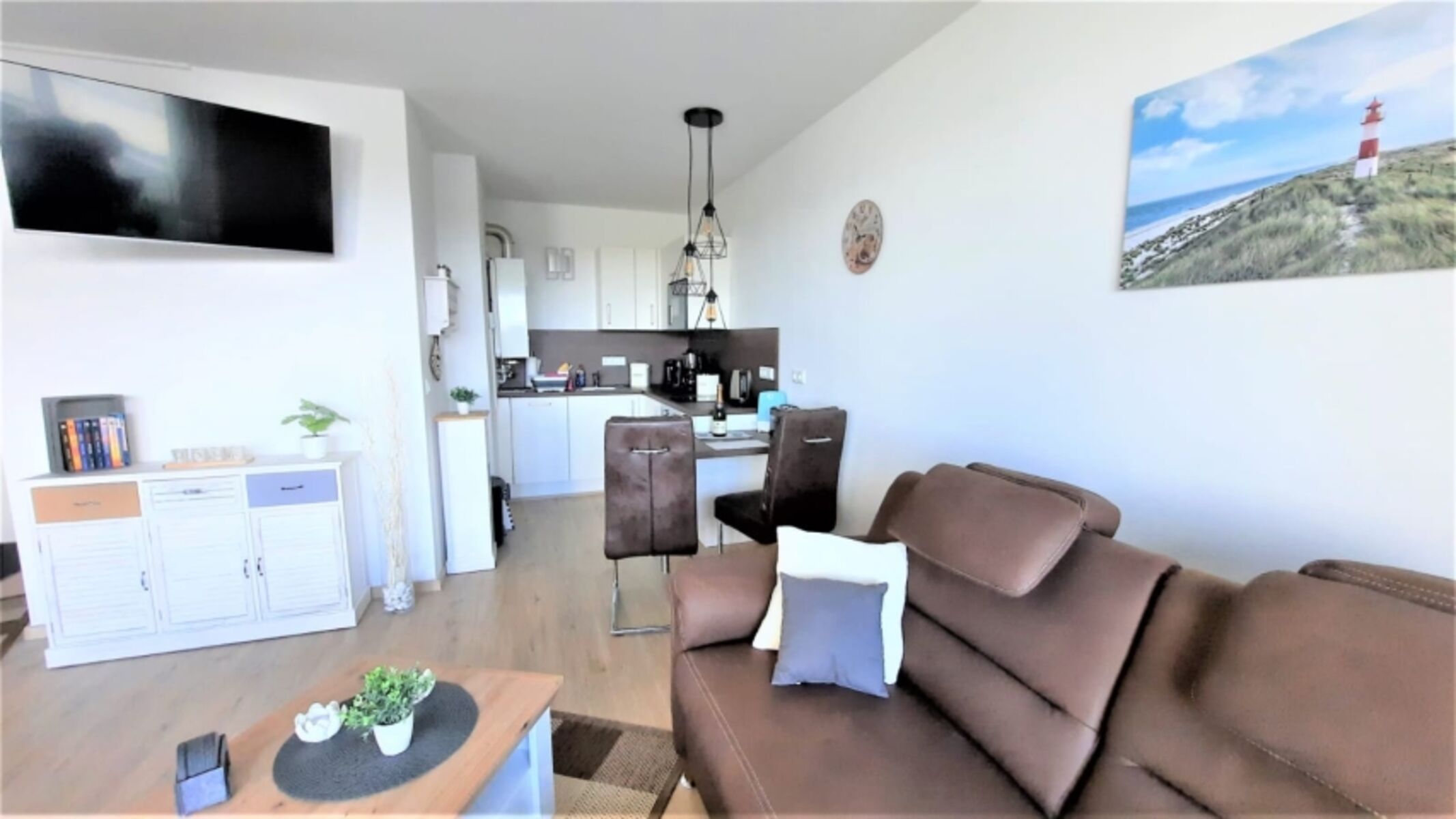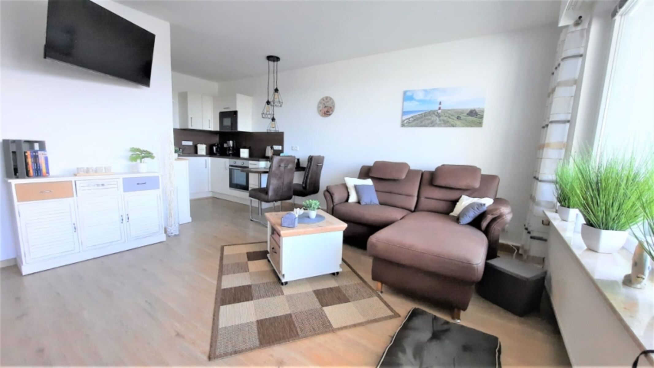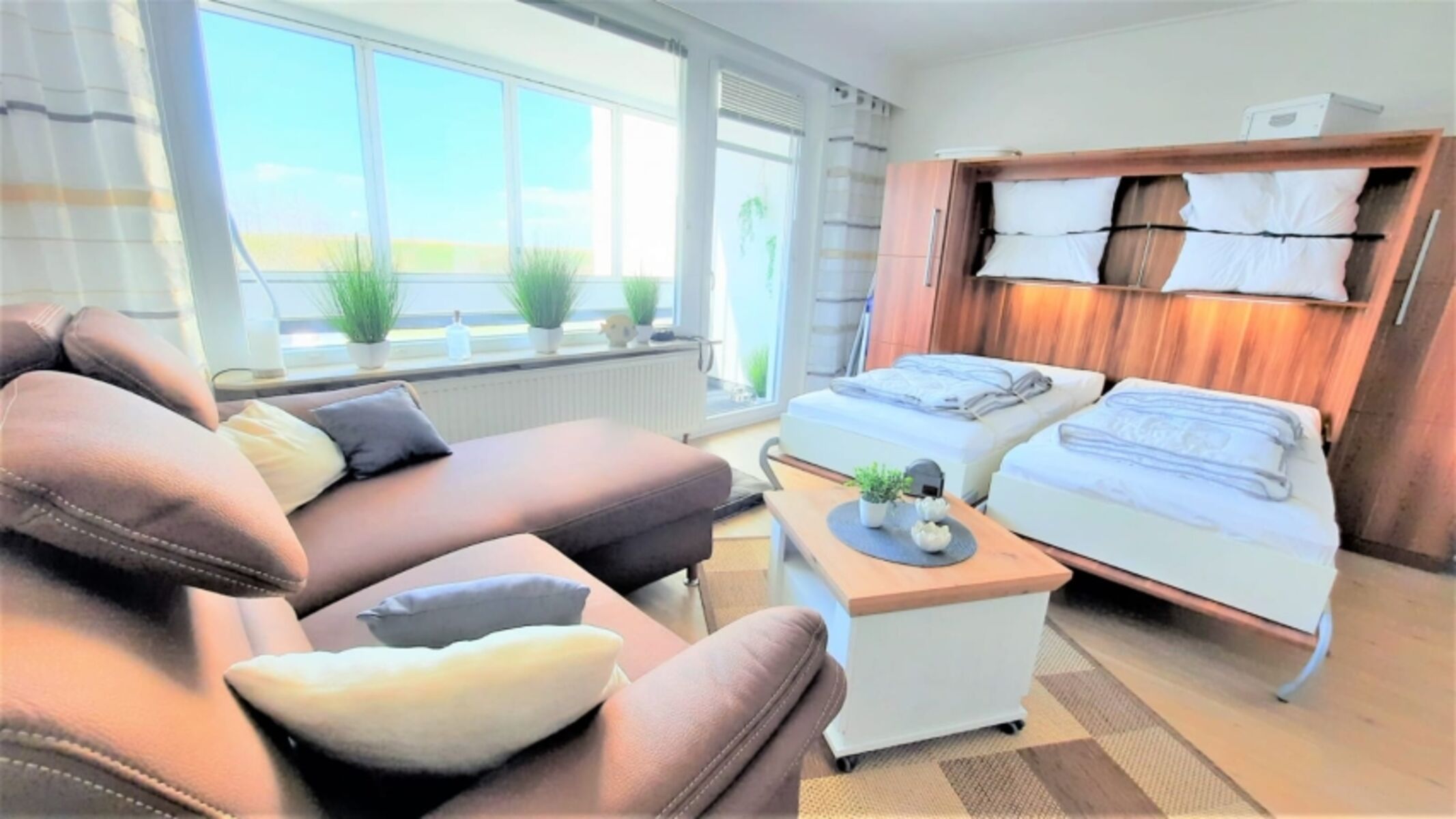 Sie wohnen in einem 2022 komplett sanierten 1-Zimmer-Appartement für bis zu 2 Personen im 1. OG auf ca. 35 qm Nutzfläche direkt am Deich. Der Wohn-/Schlafraum ist wie folgt ausgestattet: Schrankbett einzeln ausklappbar, voll ausgestattete Küche, schwenkbarer Smart-TV, kostenloses W-LAN. Das Bad verfügt über eine Walk-Inn Dusche. Der komplett verglaste Westbalkon lädt zum Verweilen ein. Die Glasfront kann komplett aufgeschoben werden. Ihr Auto findet seinen Platz in der Einzelgarage. Maße Garagentor: 200 cm Höhe * 250 cm Breite, Garagentiefe 500 cm.