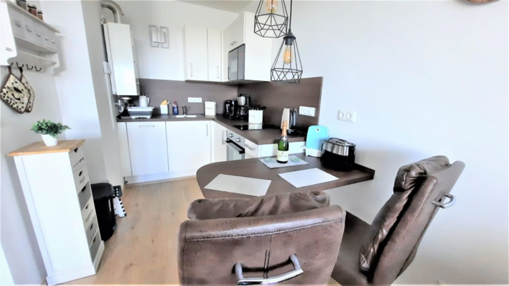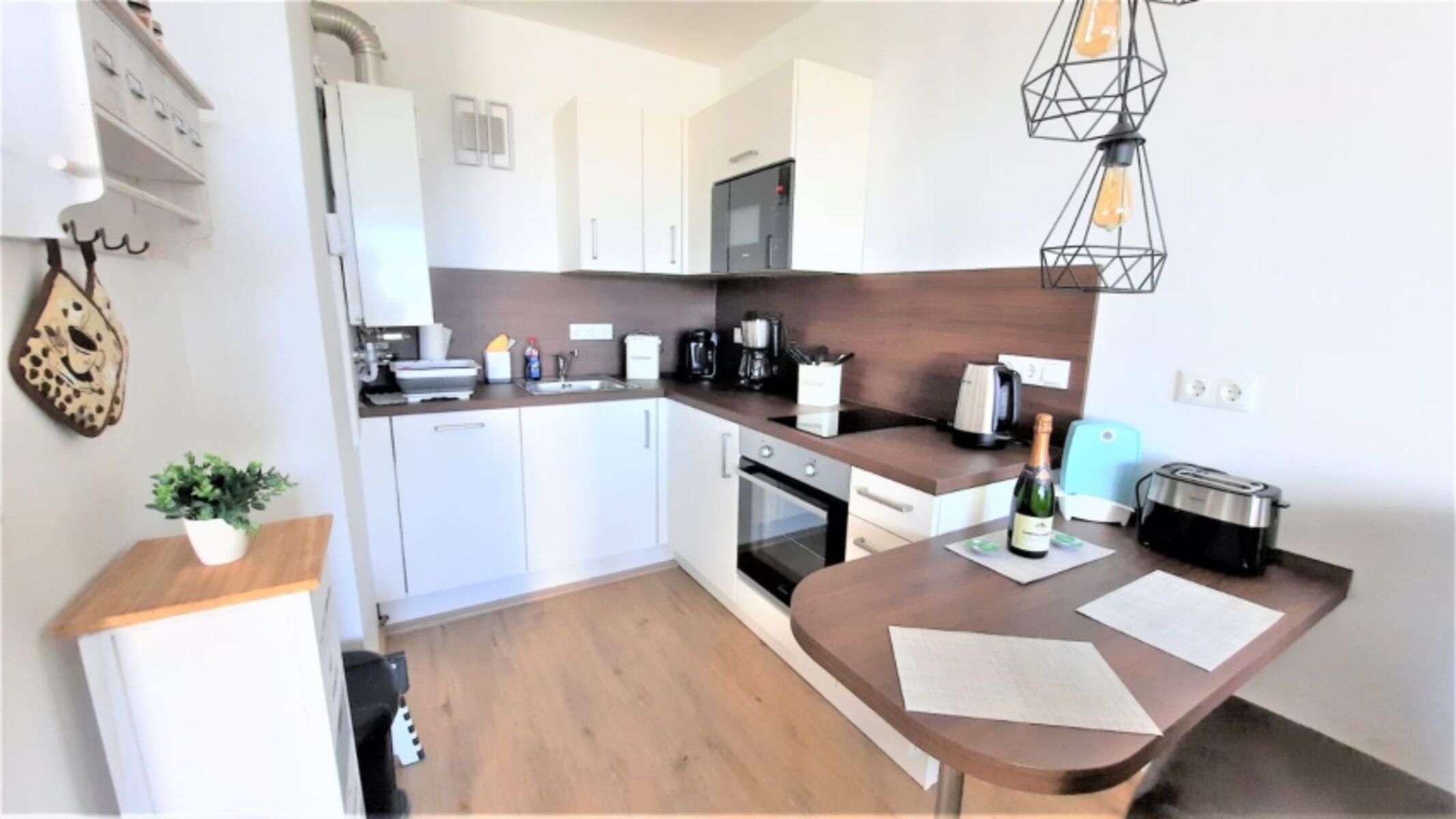 Cerankochfeld, Tassimo-Kaffeautomat, Mixer, Korkenzieher / Flaschenöffner, Gewürze (Salz, Pfeffer, Zucker), Mülltüten, Essplatz in der Küche