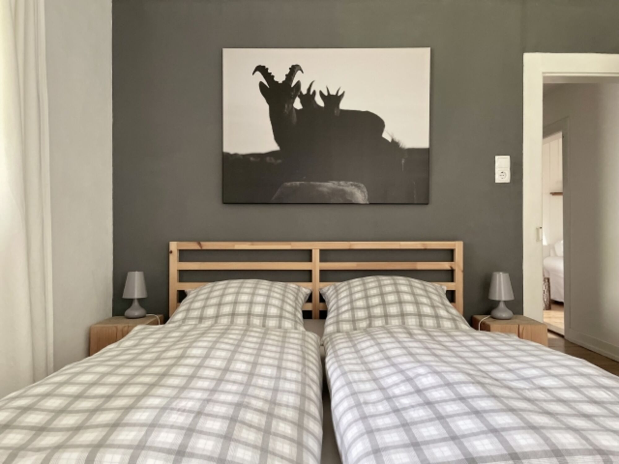 Im 2.OG gibt es zwei handgefertigte Einzelbetten aus Holz mit den Maßen 1x2m. Die beiden Zimmer im 2.OG sind nur mit einer Schiebetür miteinander verbunden/voneinander getrennt, die natürlich nicht 100% dicht schliesst. Das erste Zimmer mit den beiden Einzelbetten ist ausserdem Durchgangszimmer in das dahinterliegende Schlafzimmer.