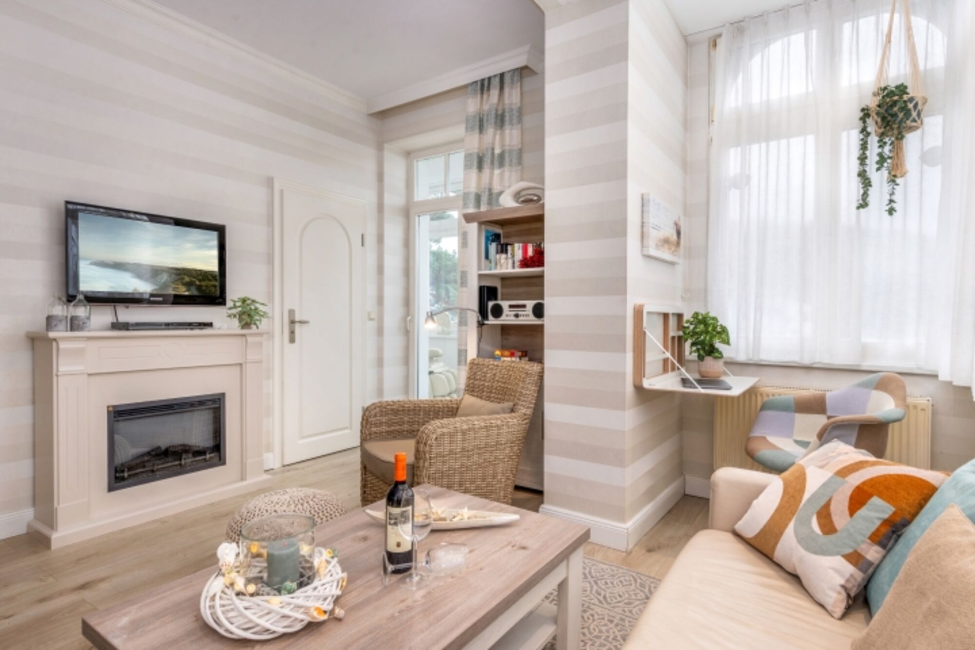 Sie haben sich Arbeit mitgebracht? Dann nutzen Sie gern die hübsche Workation-Station im Wohnzimmer mit kleinem Schreibtisch!
