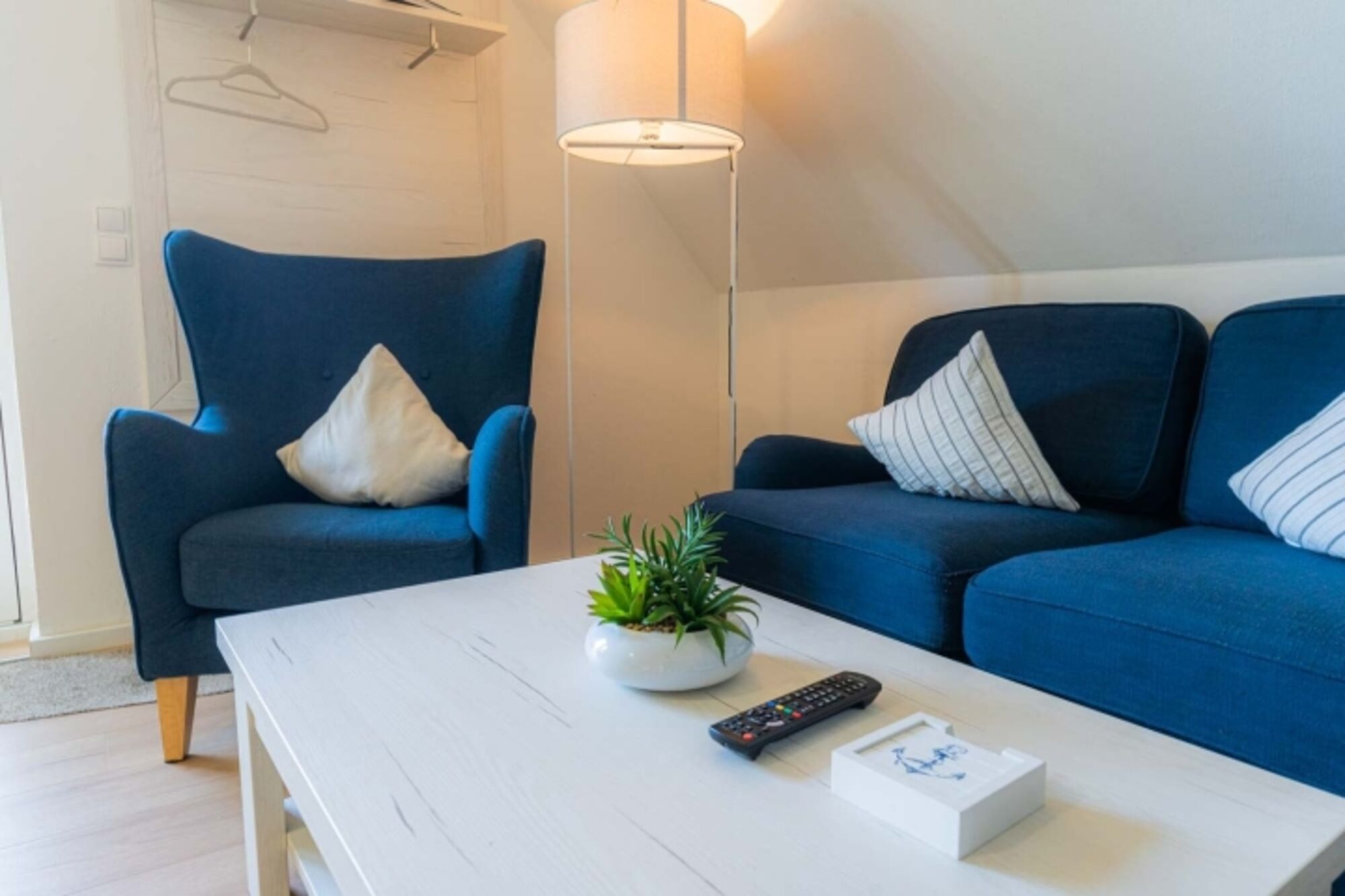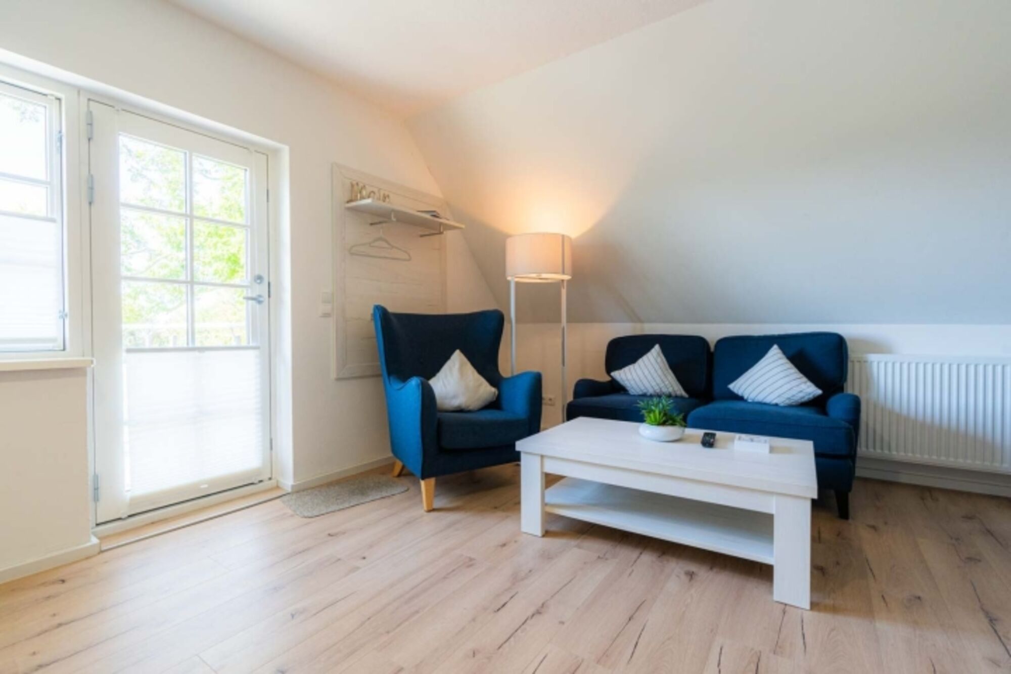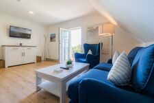 Wohnzimmer mit Sofa, Sessel, SMART-TV und Esstisch mit 4 Stühlen. Offene Küche mit Backofen, Mikrowelle, Geschirrspüler und Kühlschrank (Gefriermöglichkeit im Gemeinschaftsraum). Auf der Außentreppe vor dem Eingang zur Wohnung befindet sich ein möblierter Anbaubalkon mit herrlichem Ausblick nach Westen.
