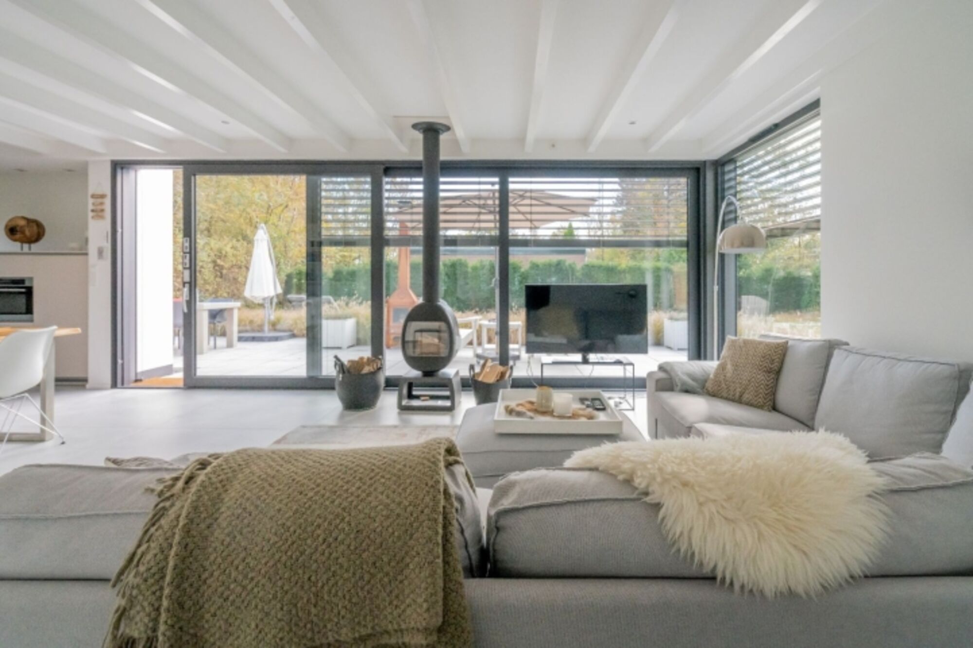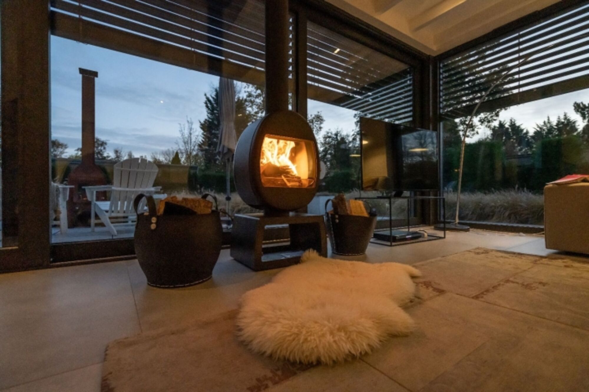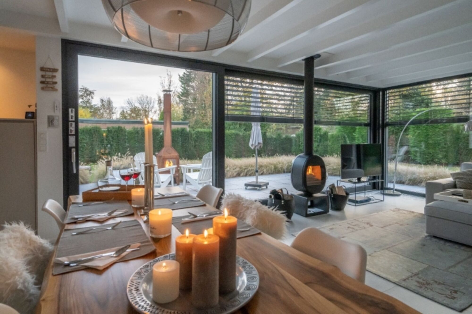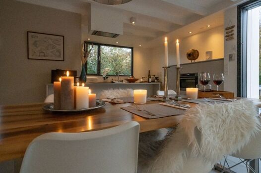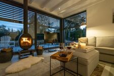 Das stilvoll eingerichtete Wohnzimmer mit neuem, modernem Kaminofen hat eine große Schiebetür, wodurch Innen und Außen sehr schön ineinander übergehen. Im Sommer können Sie die Außenjalousien elektrisch bedienen, so dass die Wohnungstemperaturen immer angenehm sind. In den anderen Jahreszeiten verfügen Sie über Fußbodenheizung. Digitalfernsehen und gratis WLAN sind vorhanden. Hier lässt es sich zu jeder Jahreszeit gut leben.