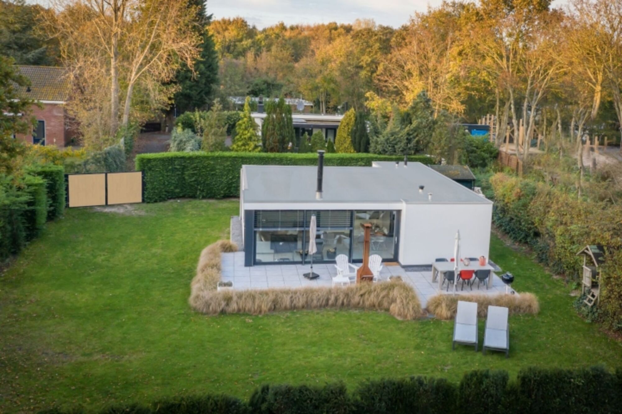 Freistehende Ferienhaus mit umzäuntem Garten und überdachter Terrasse
