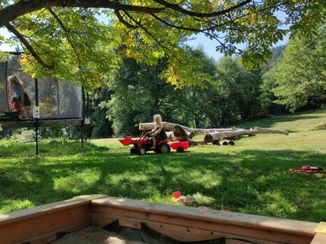 Die Ferienwohnung „Dachsbau“ liegt auf der Südseite des Haupthauses und verfügt über einen eigenen eingezäunten Garten mit Terrasse (ab ca. 15. Juli 2024 Zaun mit Zaunhöhe ca. 1,25 cm) und direktem Zugang zum Gelände. Über einen gepflasterten Weg durch Wiesen ist diese Wohnung zu erreichen, ca.30 m vom Parkplatz.