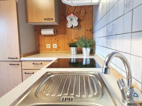 4-Platten Herd, Cerankochfeld, Dunstabzugshaube, Kühlschrank mit Gefrierfach, Eierkocher, Korkenzieher / Flaschenöffner, Gewürze (Salz, Pfeffer, Zucker), Geschirrhandtücher, Mülltüten, Essplatz in der Küche, TV in der Küche