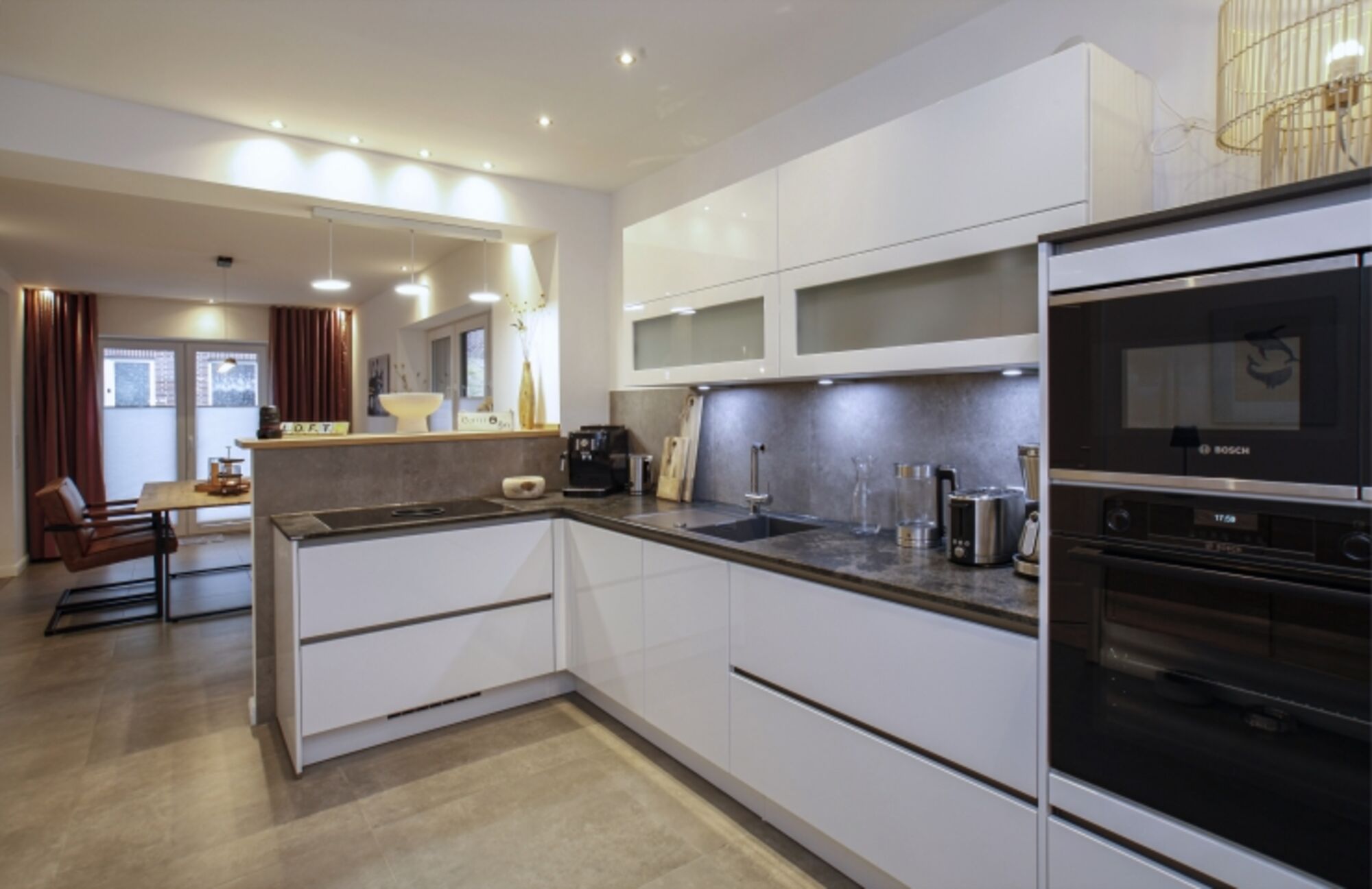 4-Platten Herd, Induktionsherd, Dunstabzugshaube, Kühlschrank mit Gefrierfach, Kaffeevollautomat, Korkenzieher / Flaschenöffner, Gewürze (Salz, Pfeffer, Zucker), Geschirrhandtücher, Mülltüten, Essplatz in der Küche