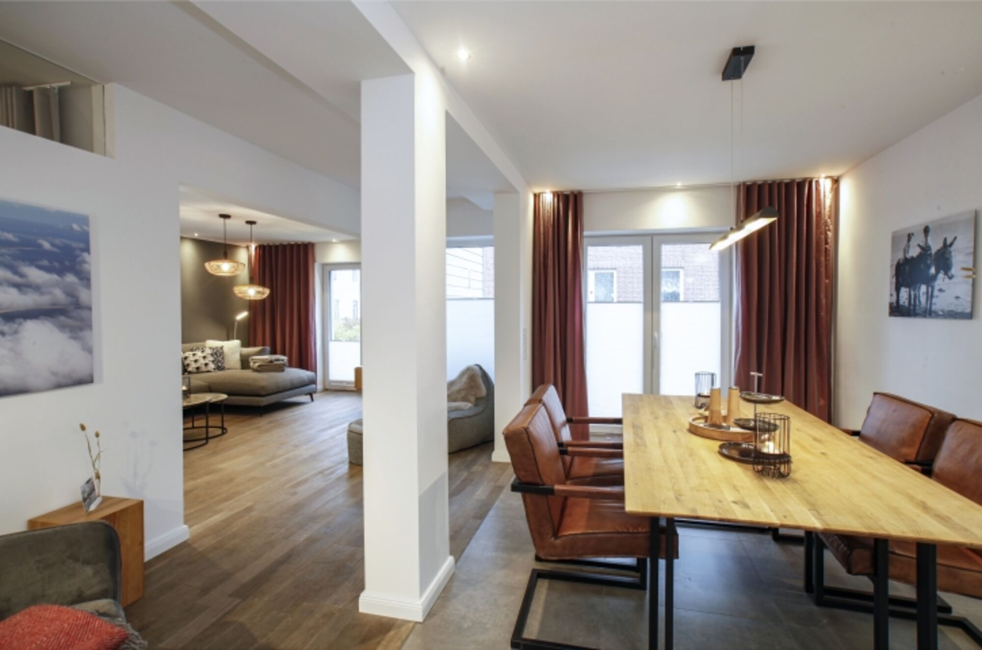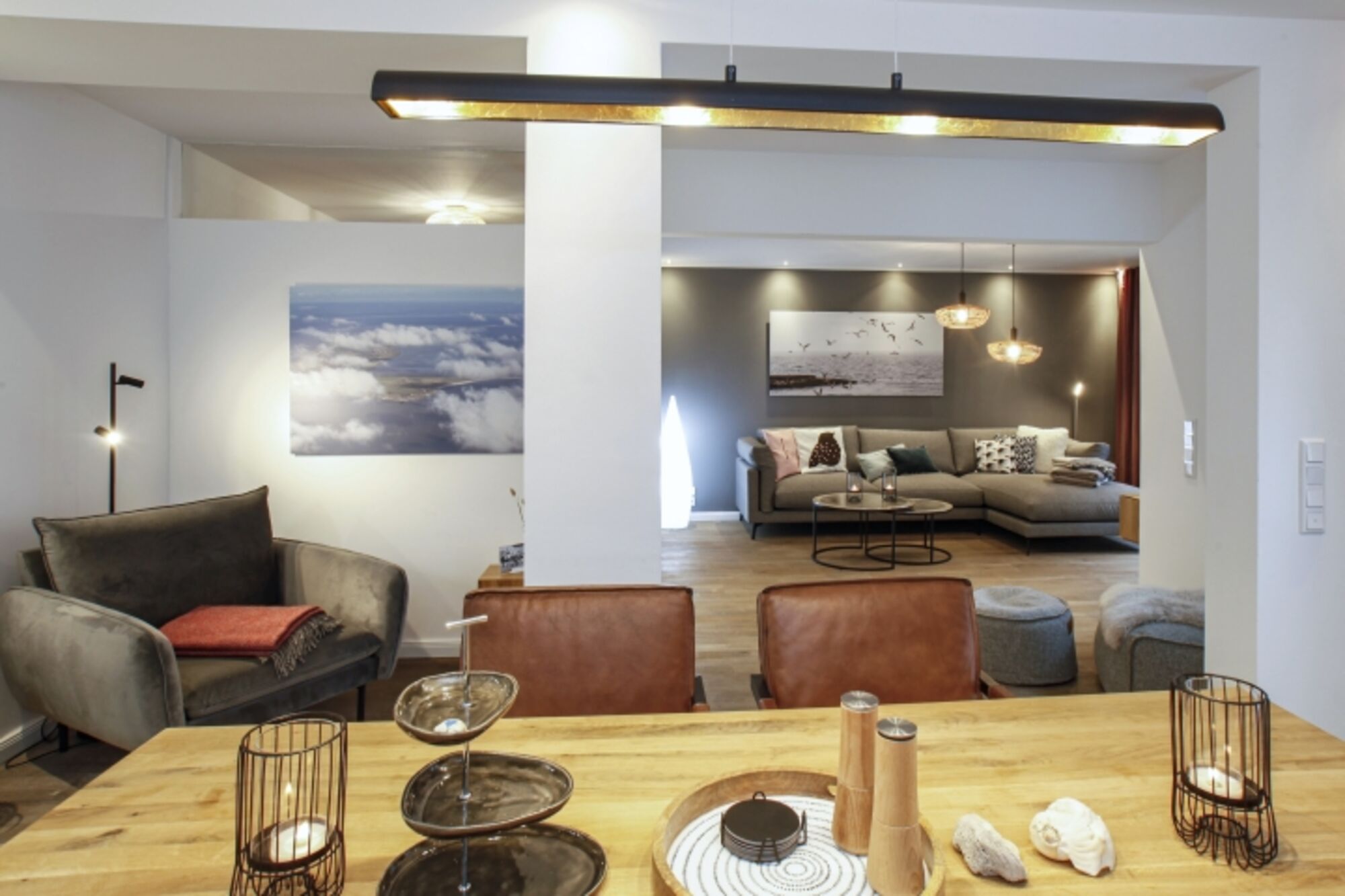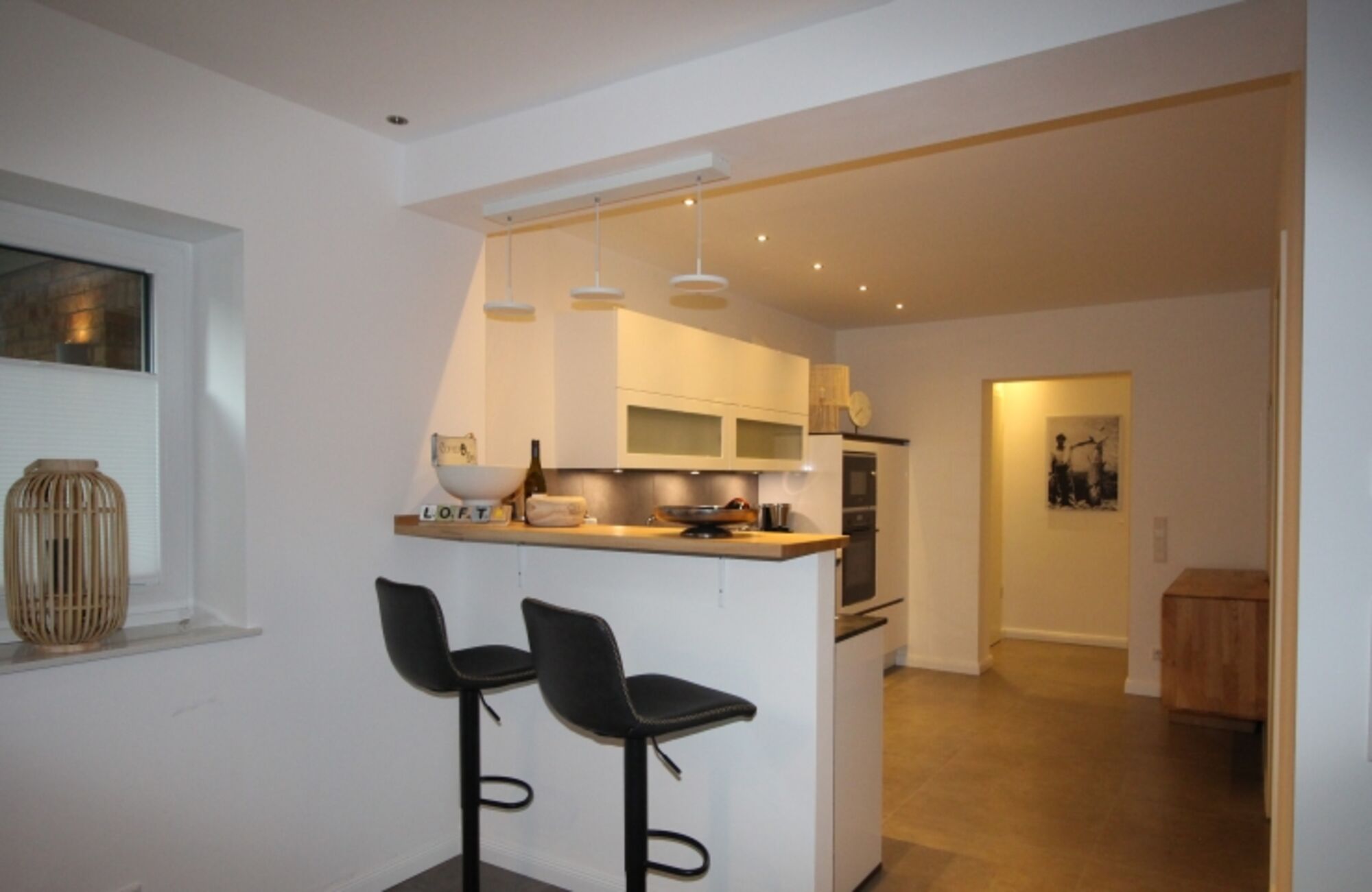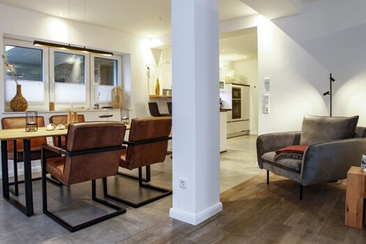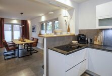 Sehr großer offener Wohnraum mit großem Sofa, smart-TV und gemütlichen Leseecken, offene Küche mit Zugang zur Terrasse, zwei Schlafzimmer , eines davon als gemütliches Nest ins Wohnzimmer integriert (siehe Foto, Verdunkelungsvorhang ), zwei Duschbäder, top ausgestattete Küche mit großem Esstisch und Ledersesseln, zusätzliche Bar, Kaffeevollautomat,