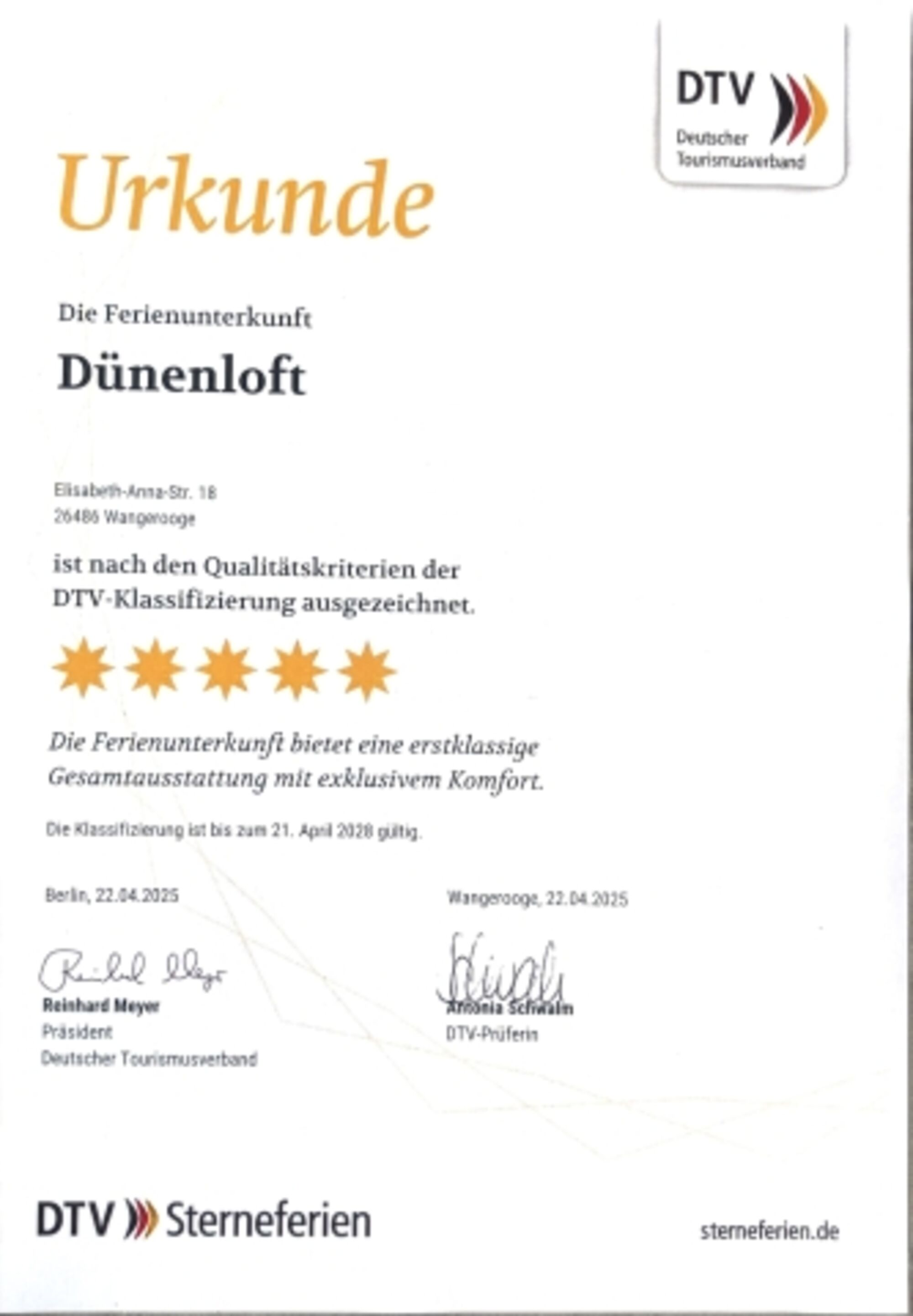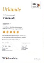 Unser Dünenloft wurde mit 5 Sternen vom Deutschen Tourismus Verband (DTV) in der höchsten Kategorie zertifiziert