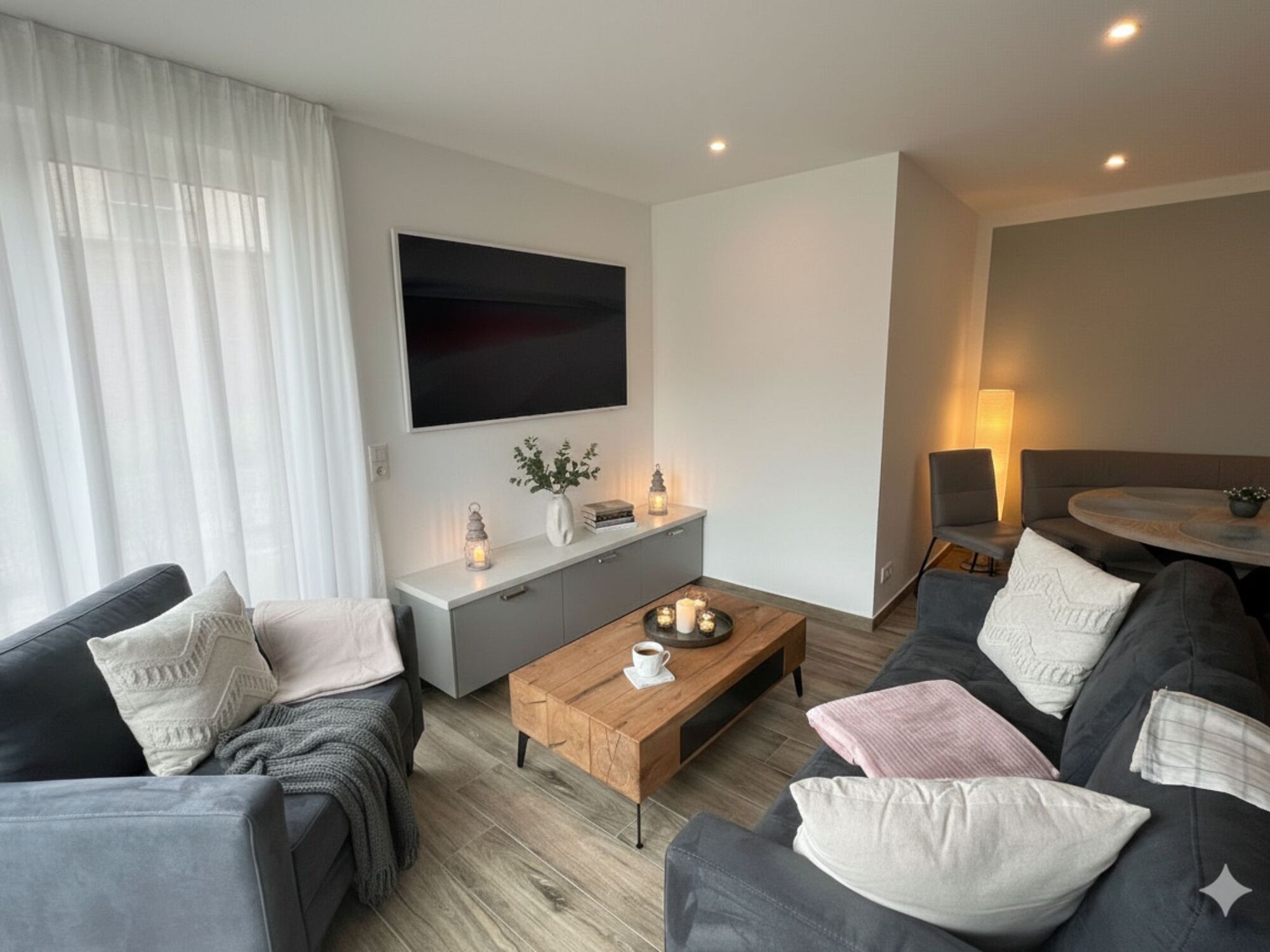 Dreh- und Angelpunkt des Ferienhauses ist der offen gestaltete Wohn- und Essbereich mit angeschlossener Küche. Die lichtdurchfluteten Räumlichkeiten sind farbschematisch hell gehalten und mit modernem Mobiliar eingerichtet. Gerade nach langen, aktivitätsreichen Tagen kommt man gerne nach Hause zurück und kann den Abend in guter Gesellschaft ausklingen lassen.