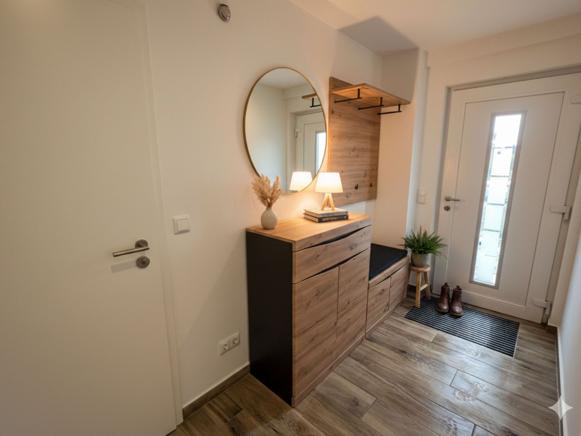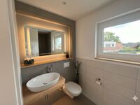 Ein Badezimmer mit ebenerdiger Dusche und der Hauswirtschaftsraum befinden sich ebenfalls im Erdgeschoss. Über eine Treppe gelangt man in das Obergeschoss. Die Schlafzimmer verfügen über ausreichenden Stauraum für Ihre Garderobe und einen kleinen Balkon auf der Westseite. Elektrische Rollläden helfen dabei, seligen Schlaf zu finden.