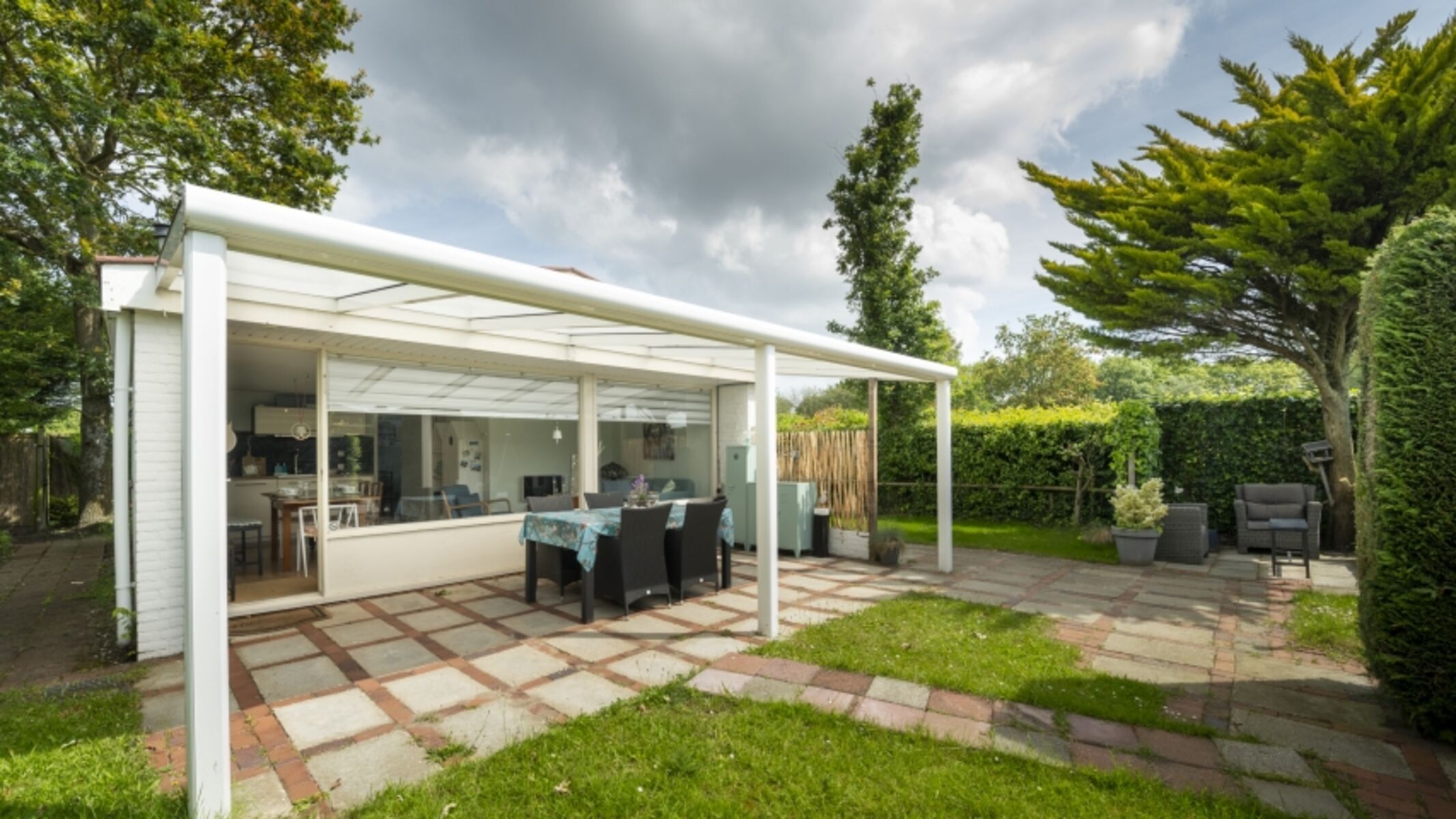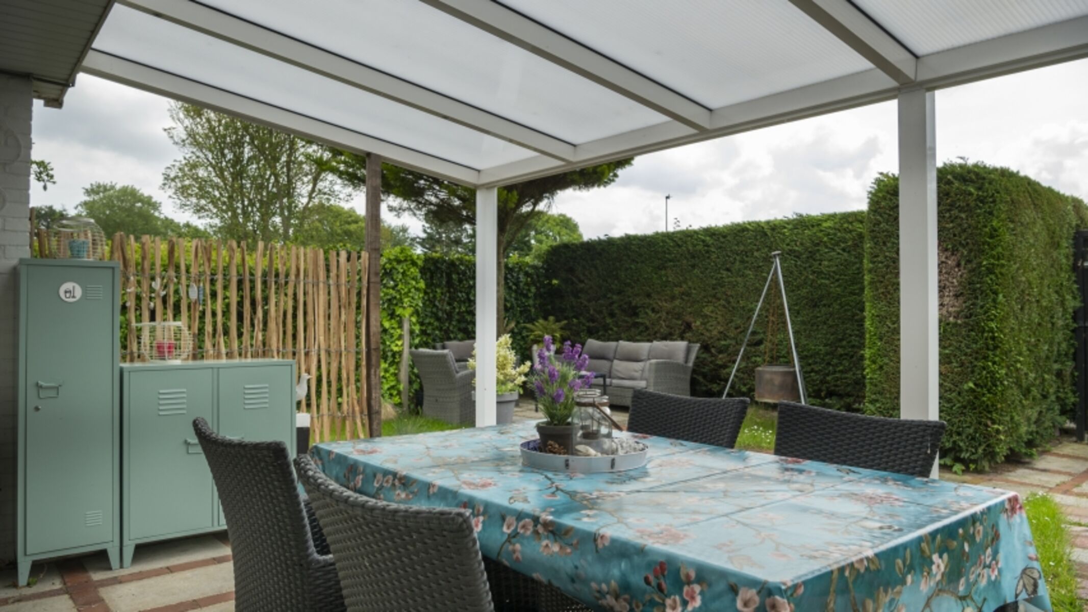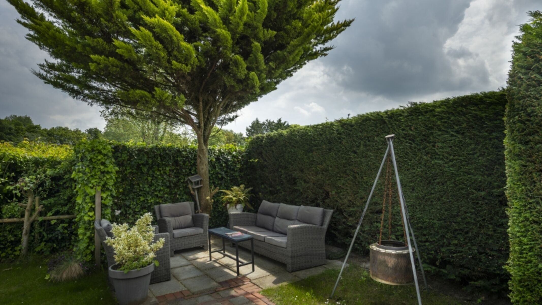 Der Garten liegt nach Süden und bietet verschiedene Terrassen, auf denen Sie die Sonne genießen können. Es gibt eine große Veranda am Haus, auf der Sie sich an kühleren Sommerabenden gemütlich entspannen können. Hier fühlen Sie sich wie alleine auf der Welt, denn der Garten ist sehr geschützt und bietet viel Privatsphäre.