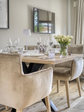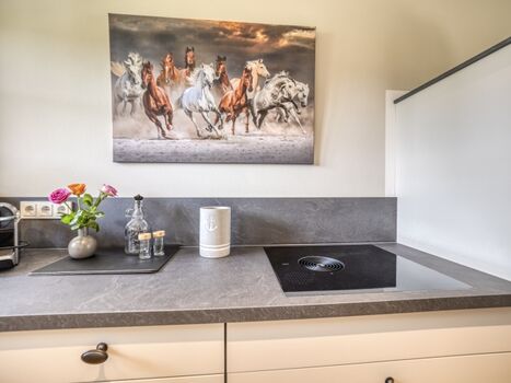 Induktionsherd, Dunstabzugshaube, Kühlschrank mit Gefrierfach, Gefrierschrank, Kaffeevollautomat, Nespresso-Automat, Mixer, Korkenzieher / Flaschenöffner, Gewürze (Salz, Pfeffer, Zucker), Öl / Essig, Geschirrhandtücher, Mülltüten, Essplatz in der Küche