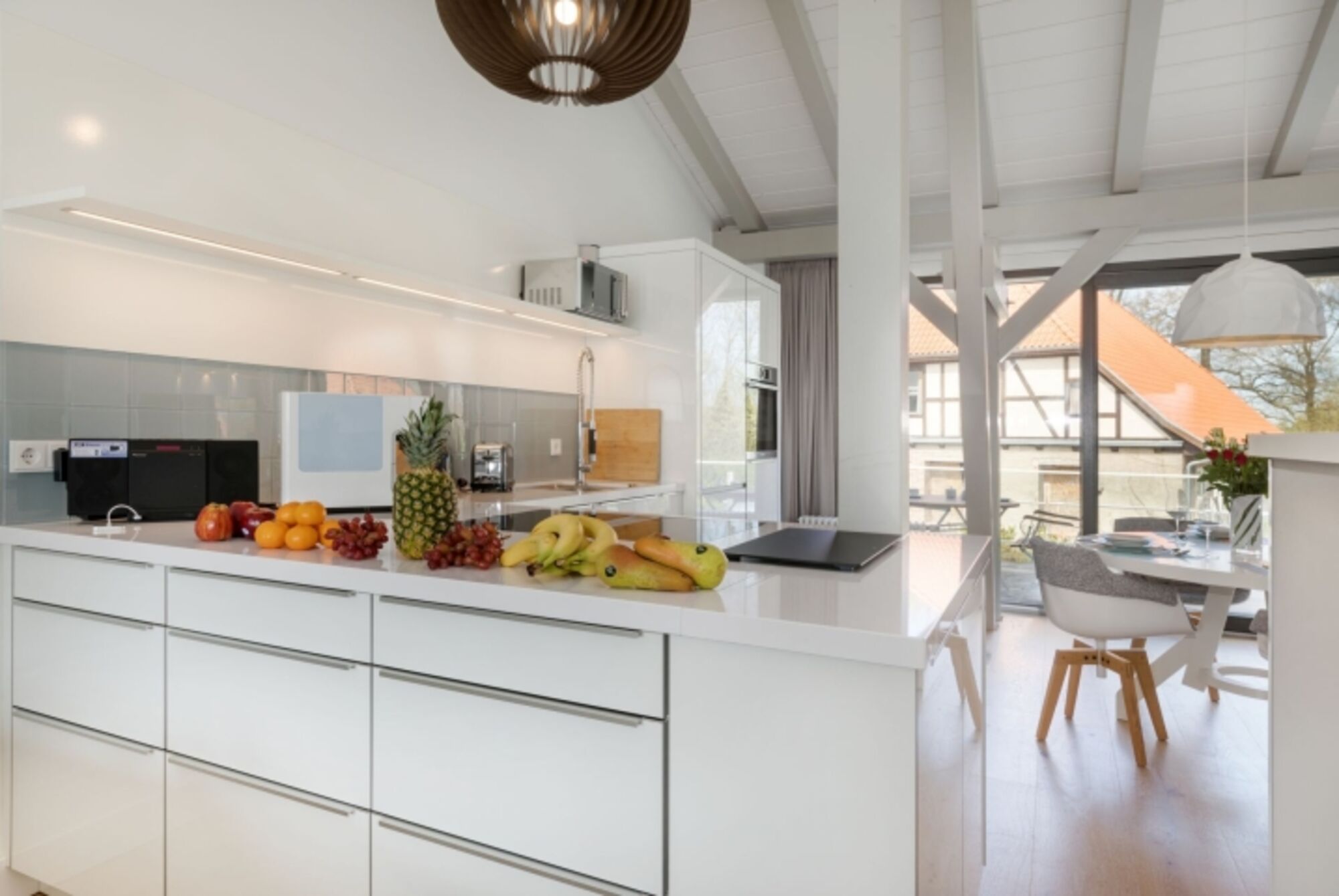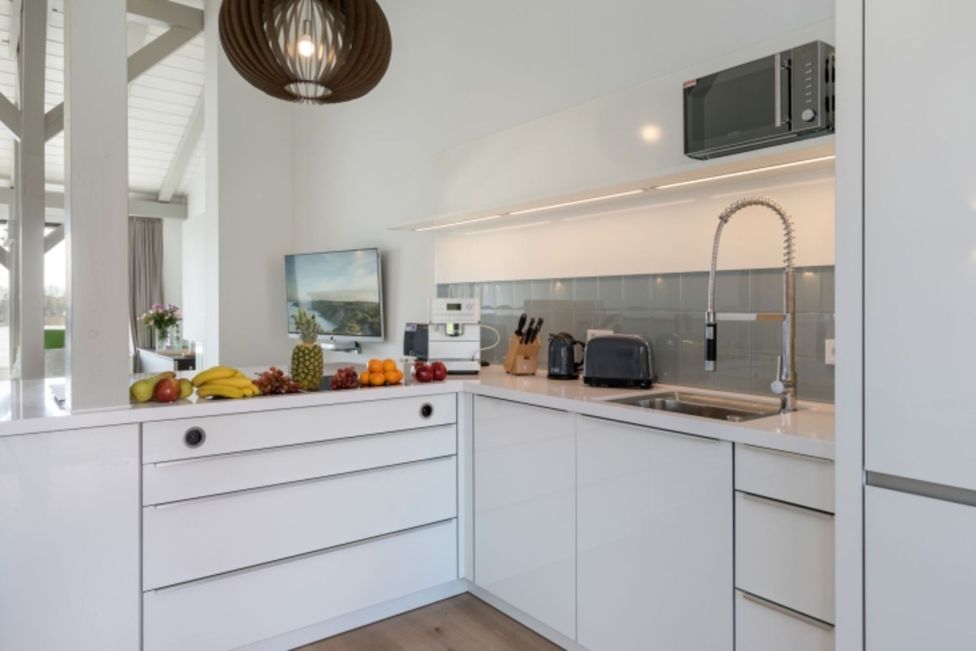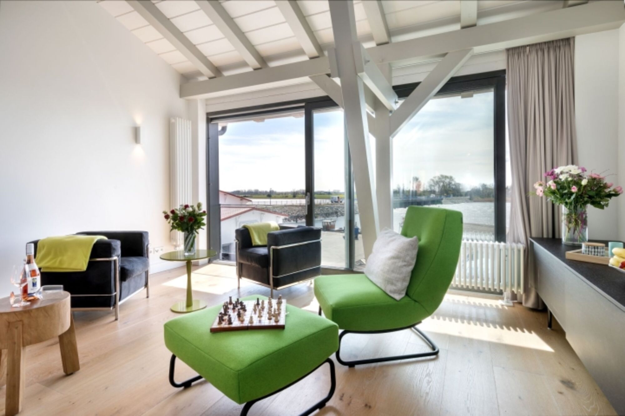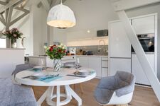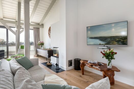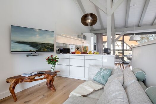 Während sich der großzügige Schlafbereich im Erdgeschoss befindet, beeindruckt der Wohnbereich im Obergeschoss mit bis zu vier Meter hohen Decken. Von dort aus kann man den Blick über den Ausläufer der Ostsee schweifen lassen. Das luxuriöse Interieur wird durch die komplett ausgestattete Küche, mehrere HDTV-Fernseher, eine HiFi-Anlage, Designermöbel und natürlich einen Internetzugang per WLAN abgerundet. Ein besonderes Highlight: Die Ferienhäuser 1 und 4 verfügen über einen großzügigen Balkon, in den Ferienhäusern 2 und 3 gibt es zusätzlich noch eine Terrasse. Damit lassen sich die Sonnenstrahlen ganz entspannt genießen.
