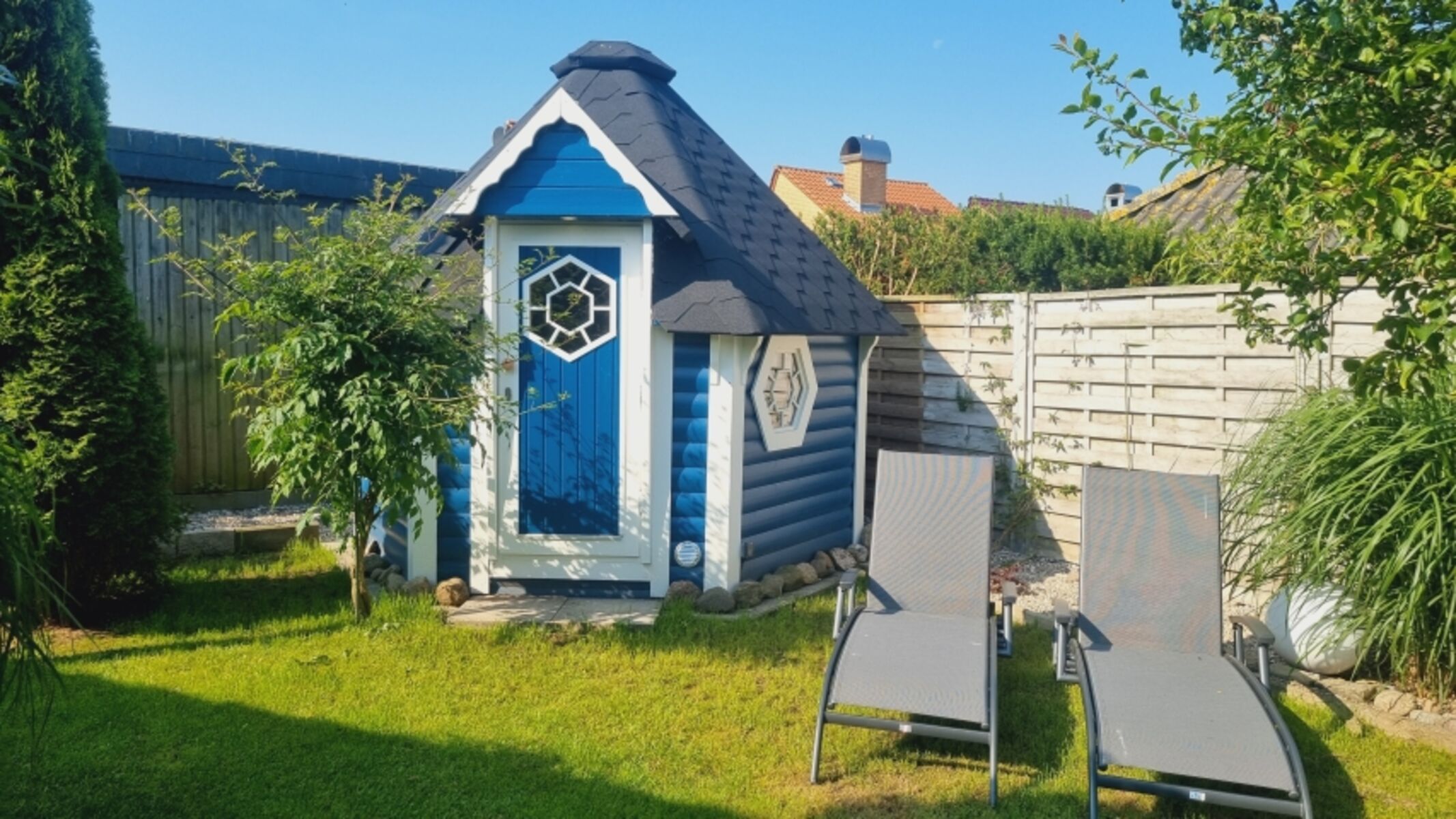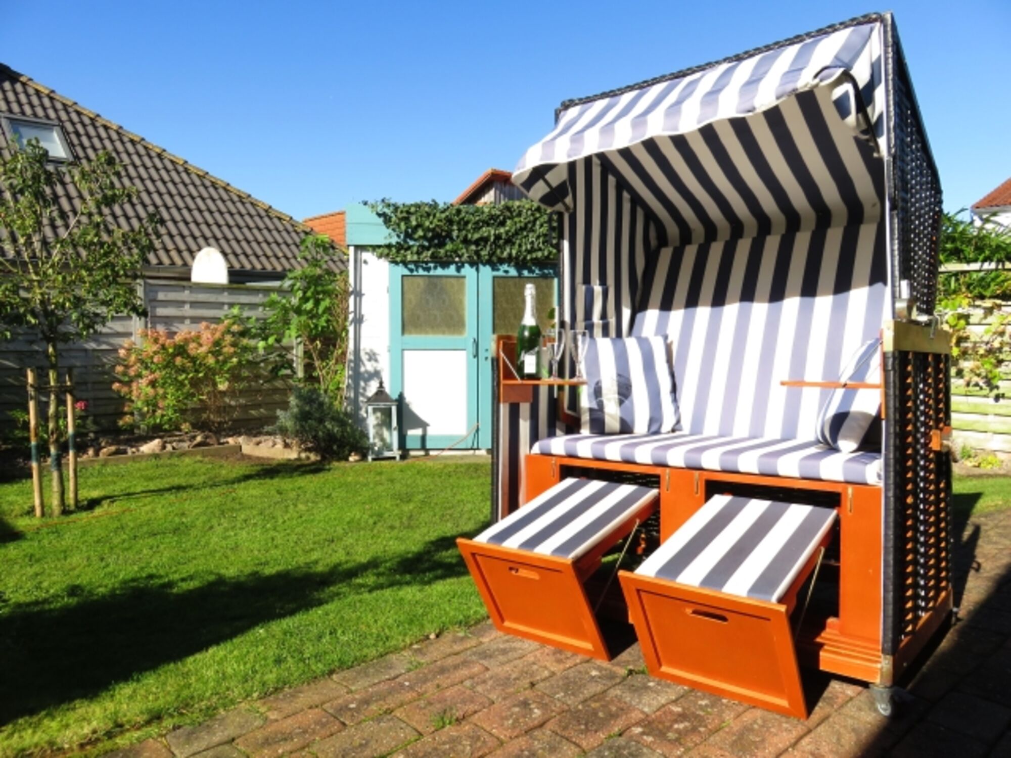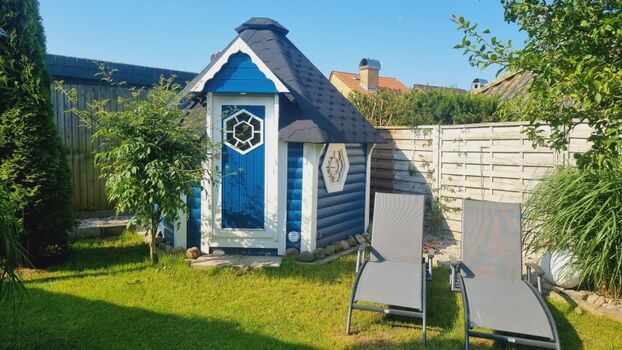 Strandkorb, Gartenmöbel, Außenkamin, Markise, Sauna im Garten
