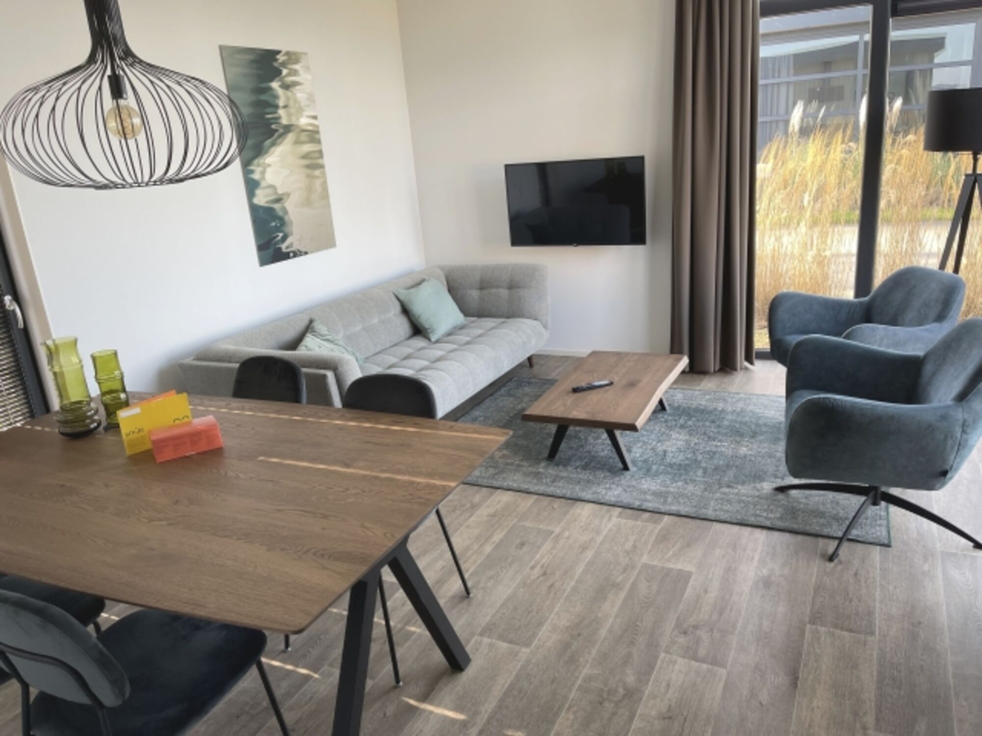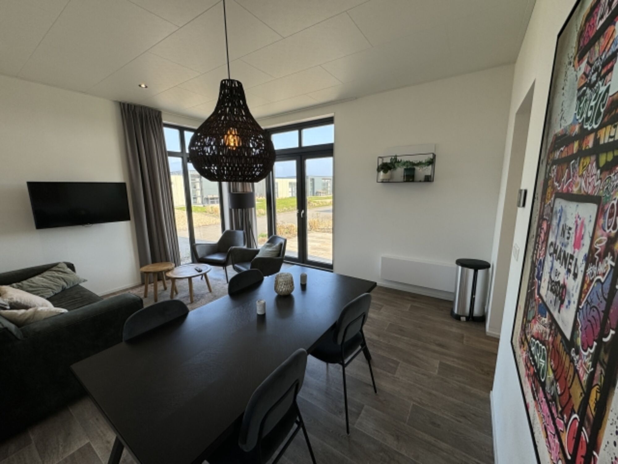 Im 60m² großen Ferienchalet erwartet Euch außerdem ein modernes Tageslichtbad mit Dusche und Toilette. Der große, helle Wohnbereich ist ausgestattet mit Esstisch und Stühlen, einem gemütlichen Sofa, schwenkbarem TV sowie zwei gemütlichen Sesseln. Smart-TV und Highspeed-Internet runden das Multi-Media Angebot ab. Die voll ausgestattete Küche ist elegant in den Flur integriert.