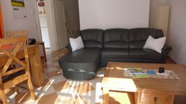 1 Schlafzimmer ca. 10 qm groß mit einem Doppelbett und einem großen Wohnzimmer mit Ledercouchbett