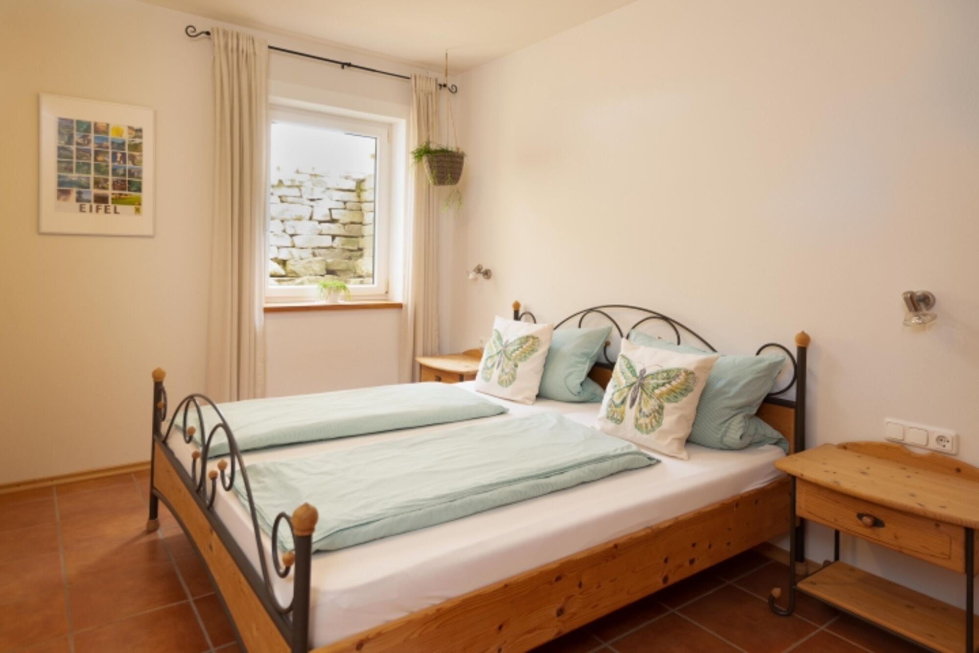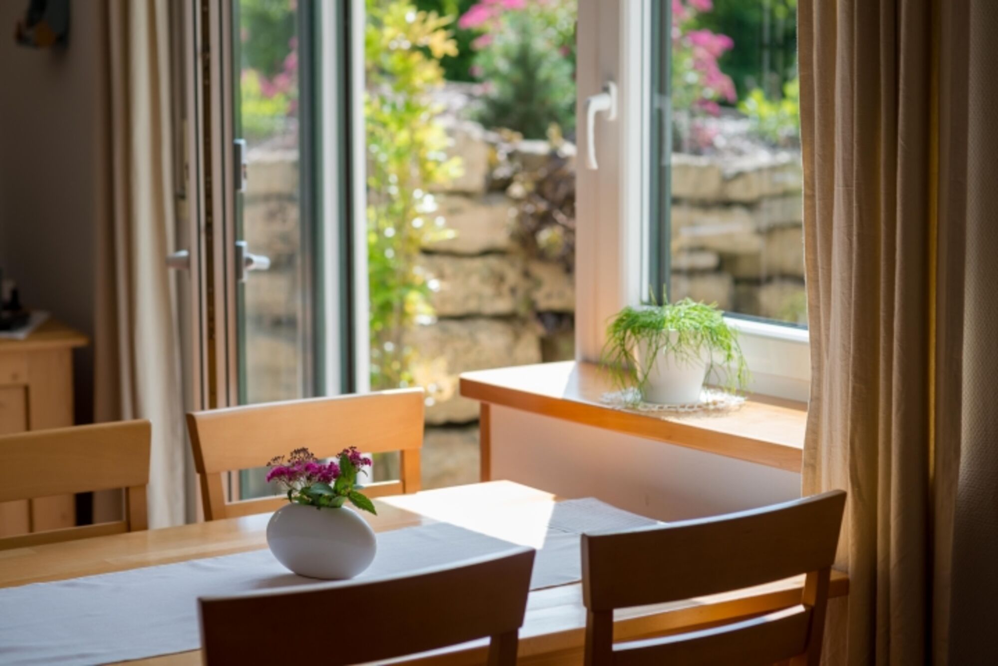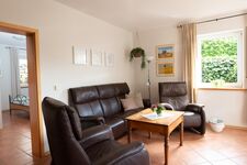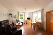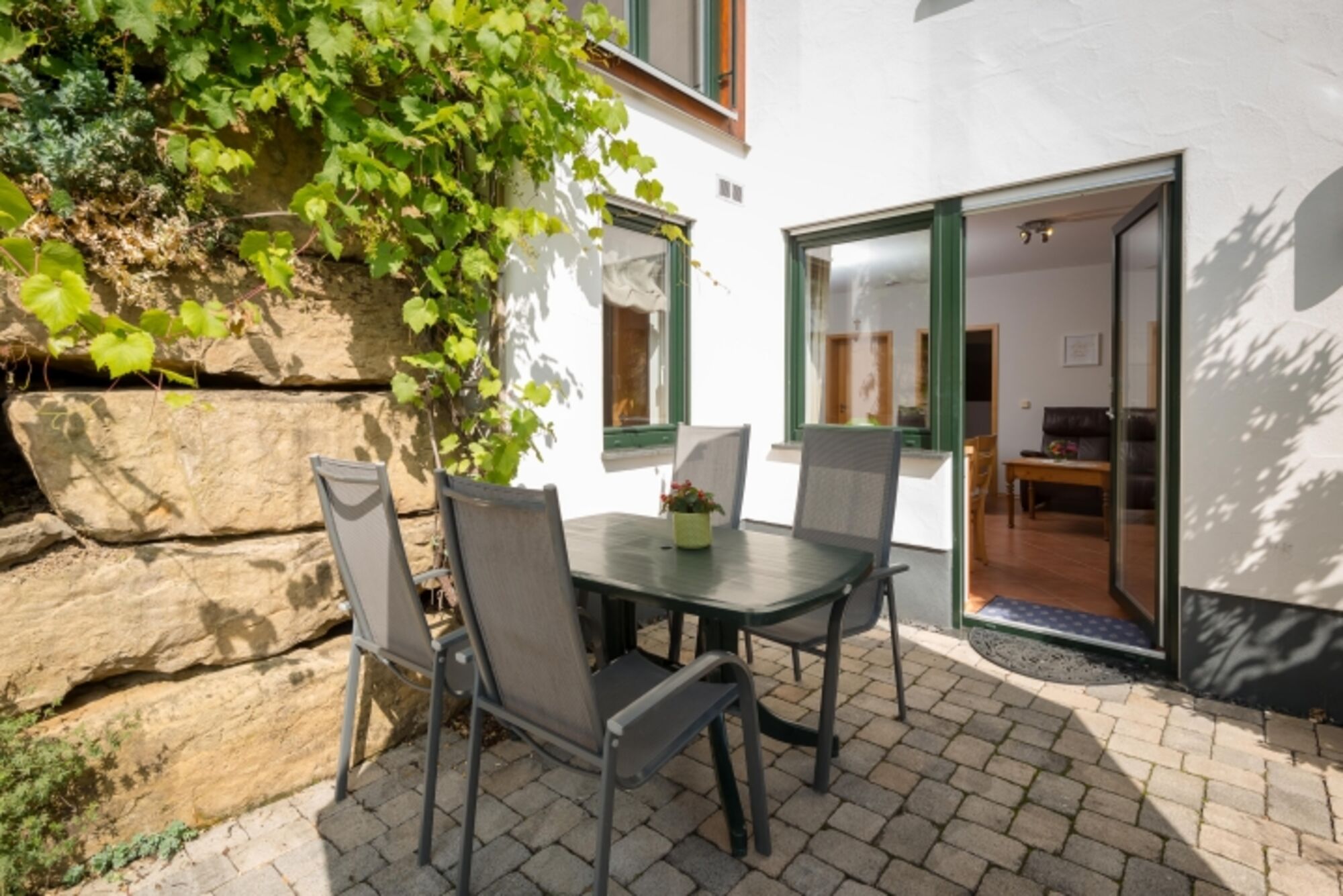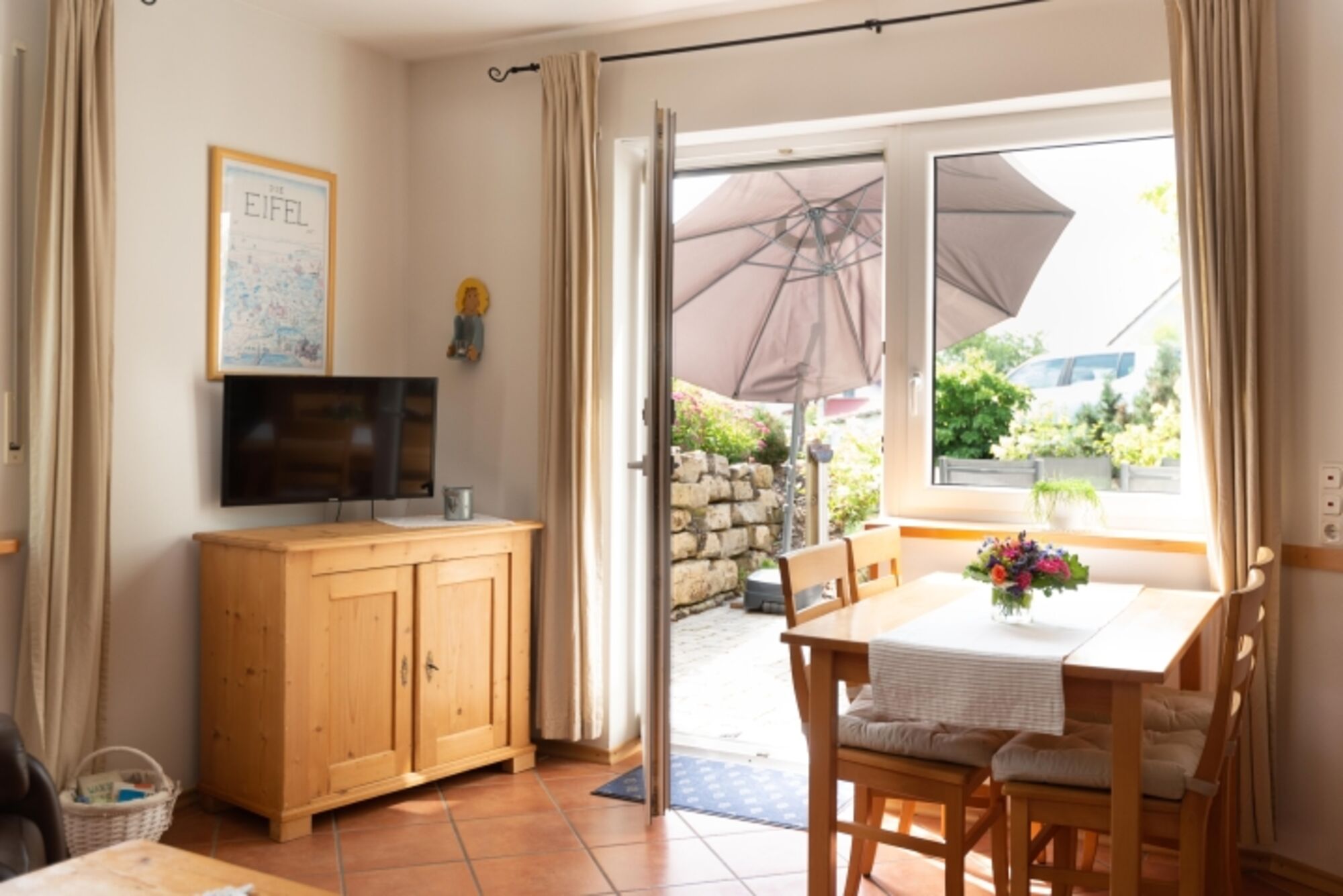 Unsere 60 qm große Ferienwohnung bietet Platz für 4 Personen. Der separate Eingang ist bequem ebenerdig begehbar und wird auch regelmäßig von Gästen mit Rollstuhl genutzt. Die von einer Natursteinmauer umgebene Terrasse nach Südosten bietet sich zum Frühstücken, Essen und Grillen an; sie ist mit Gartenmöbeln und Sonnenschirm ausgestattet. Auf dem wohnungseigenen Parkplatz können 2 Autos parken. Motorräder u. Fahrräder können nach Absprache gerne in der Garage abgestellt werden. W-Lan vorhanden.