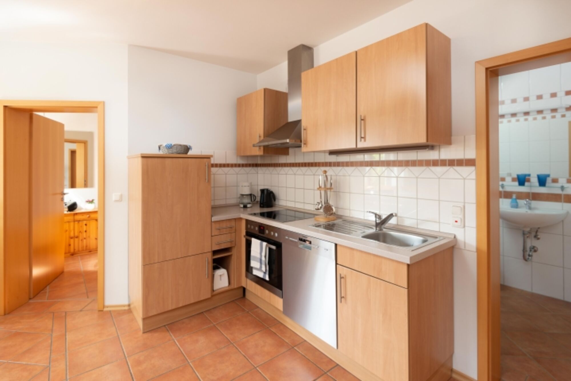 4-Platten Herd, Cerankochfeld, Dunstabzugshaube, Kühlschrank mit Gefrierfach, Korkenzieher / Flaschenöffner, Geschirrhandtücher, Mülltüten