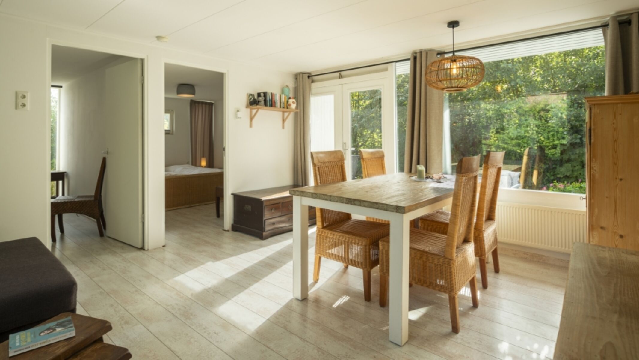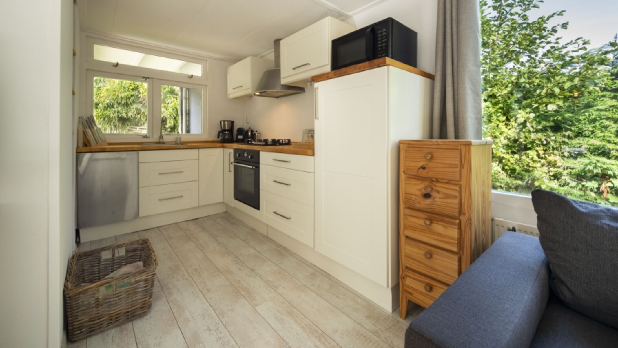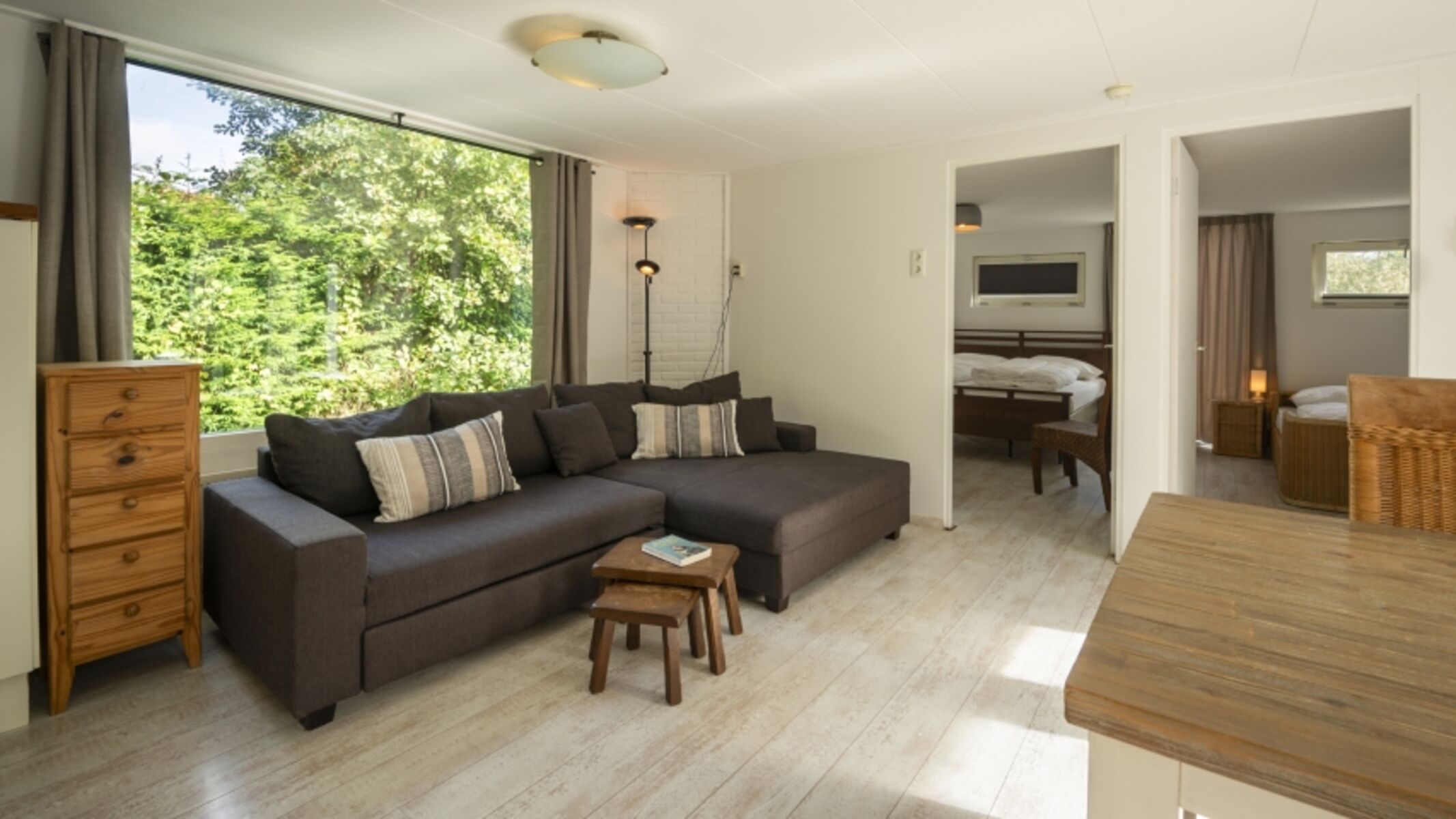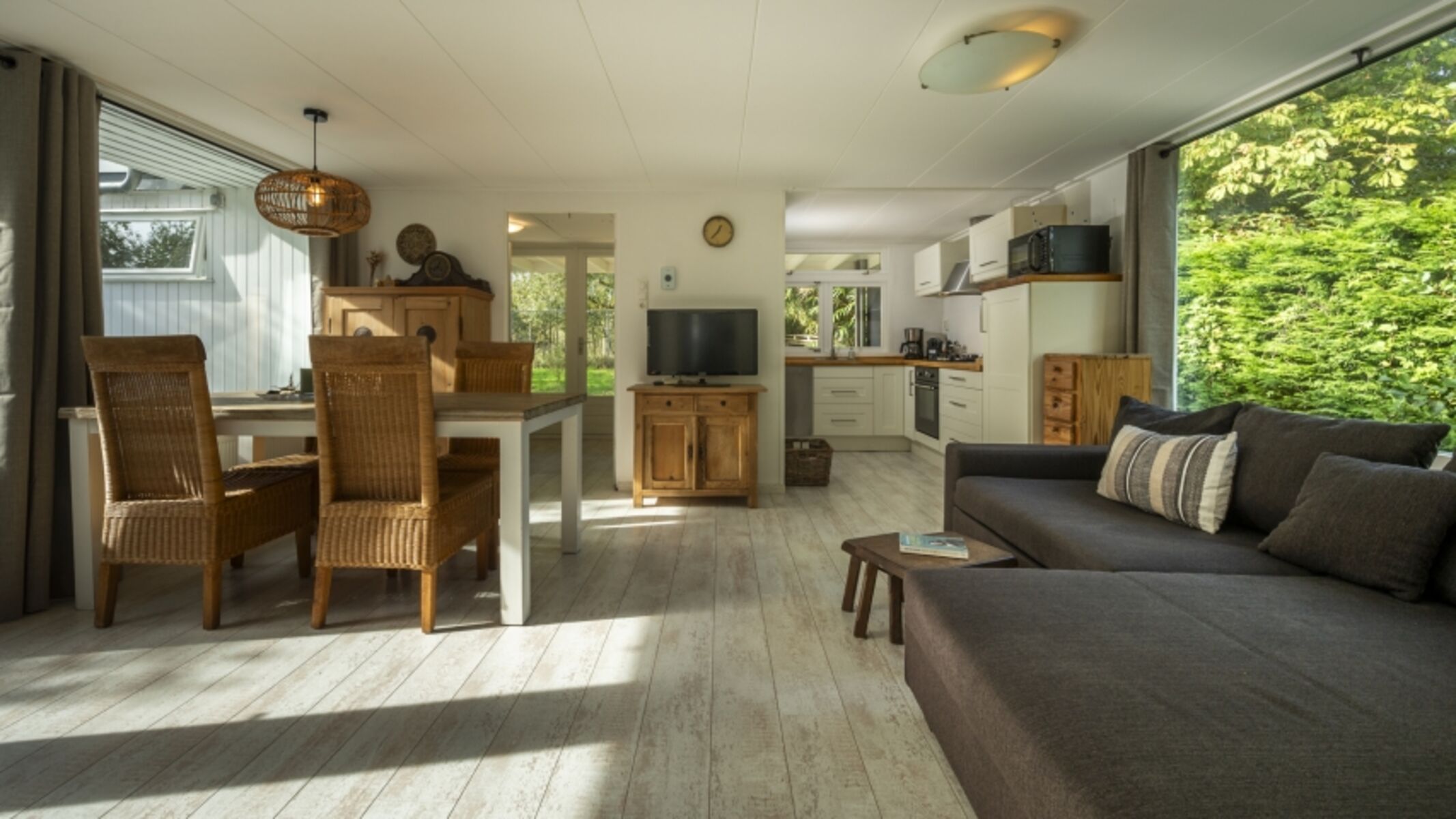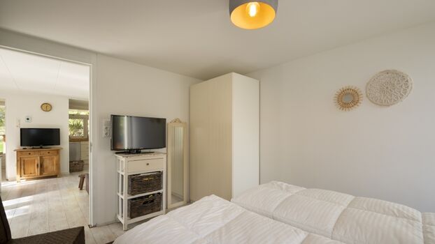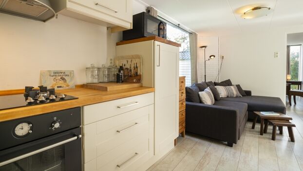 Der Bungalow verfügt über ein gemütliches Wohnzimmer mit angrenzendem Essbereich und eine offene Küche, die komplett mit modernen Geräten ausgestattet ist. Im Haus gibt es zwei Schlafzimmer, jeweils mit einem Doppelbett. Außerdem finden Sie ein Badezimmer mit begehbarer Dusche und Toilette.