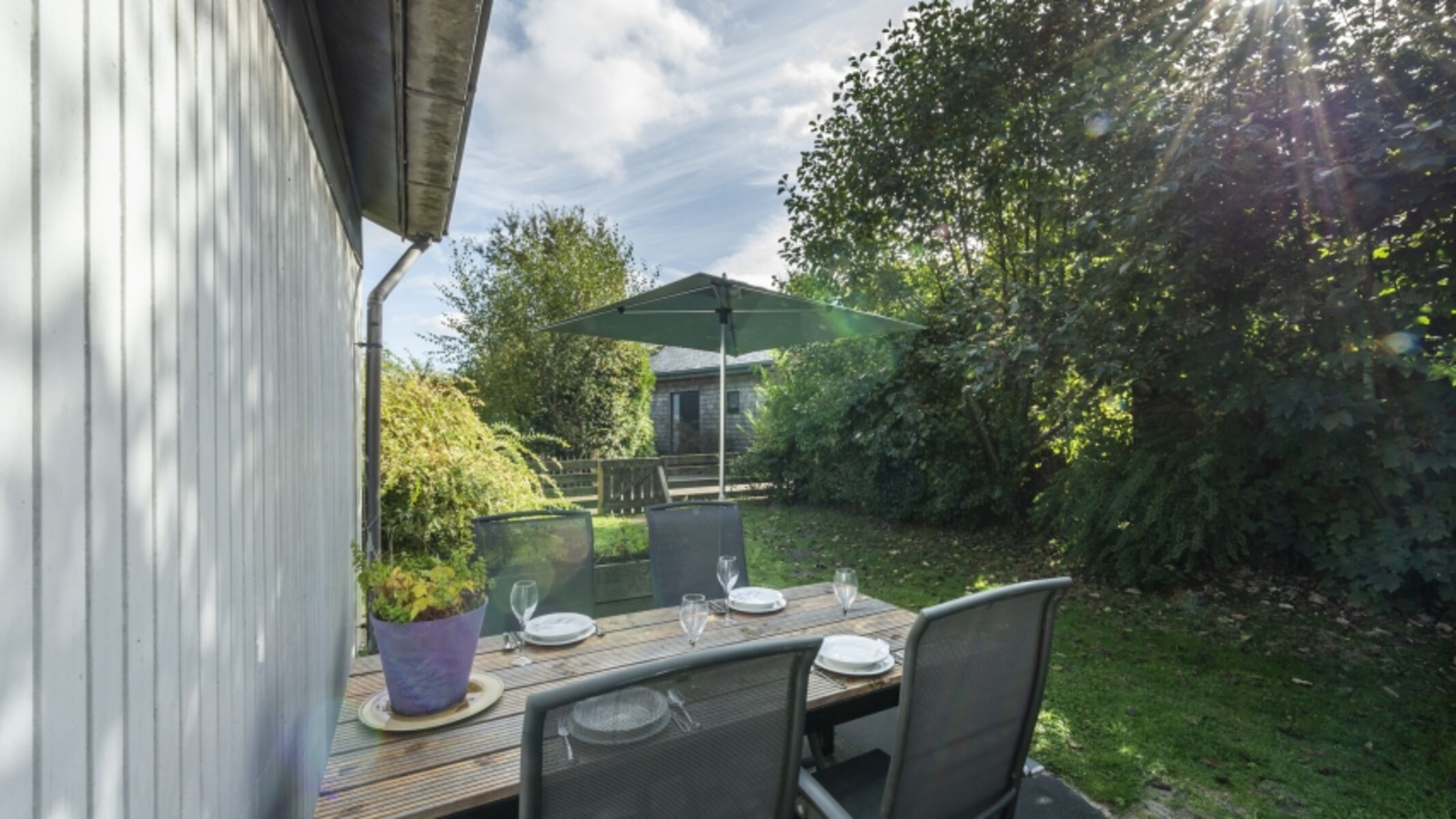 Der geschützte Garten ist mit bequemen Gartenmöbeln ausgestattet und vollständig eingezäunt. Dadurch ist Ihre Privatsphäre garantiert und auch Ihr Vierbeiner kann sich bestens amüsieren. Genießen Sie lange Abende unter der stimmungsvollen Überdachung oder stehen Sie früh auf und beobachten Sie Hirsche im Naturschutzgebiet direkt vom Garten aus.