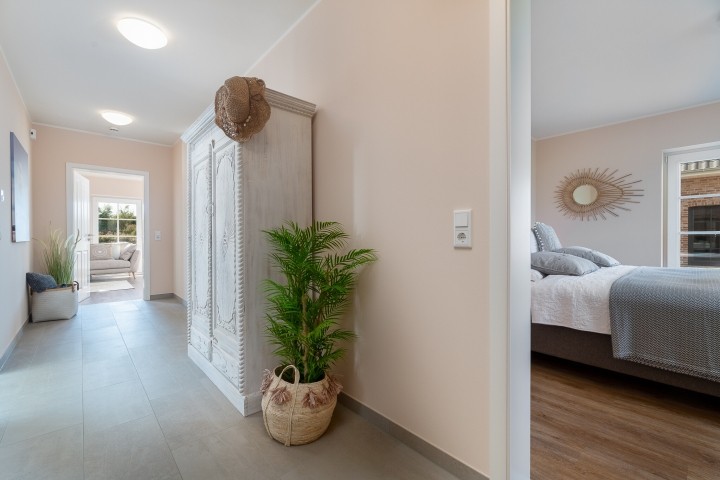 Das luxuriöse Ferienhaus "Sansibar", welches im Sommer 2021 fertiggestellt wurde, bietet auf zwei Etagen mit ausgefallenem Stil sowie besonderen Details Nordseeaufenthalt der Extraklasse. Im Erdgeschoss befindet sich das großzügig gestaltete und liebevoll eingerichtete Wohnzimmer mit Flatscreen-TV. Der angrenzende Essbereich und die offene, moderne Küche bieten alle Annehmlichkeiten, um einen tollen Kochabend zu veranstalten. Im Erdgeschoss befindet sich zudem ein Schlafzimmer mit Doppelbett, ein Badezimmer mit ebenerdiger Dusche und eine finnische Sauna. Hier können Sie sich nach langen Spaziergängen entspannen und wieder aufwärmen. Im Obergeschoss des Hauses befinden sich drei weitere Schlafzimmer mit Doppelbetten sowie zwei Badezimmer. Eines ist mit ebenerdiger Dusche und das andere mit Whirlwanne und ebenerdiger Dusche ausgestattet. Im Flur des Obergeschosses befindet der Zugang zum Spitzboden. Gerne dürfen vierbeinige Familienmitglieder auf Anfrage gegen Aufpreis mitreisen. Zum Haus gehören zudem eine möblierte Terrasse mit Sonnenschirm und eine nicht eingezäunte Gartenfläche. Auch einem gemütlichem Grillabend steht dank des Elektrogrills nichts im Weg. Vor dem Haus gibt es außerdem eine großzügig angelegte Parkplatzfläche.