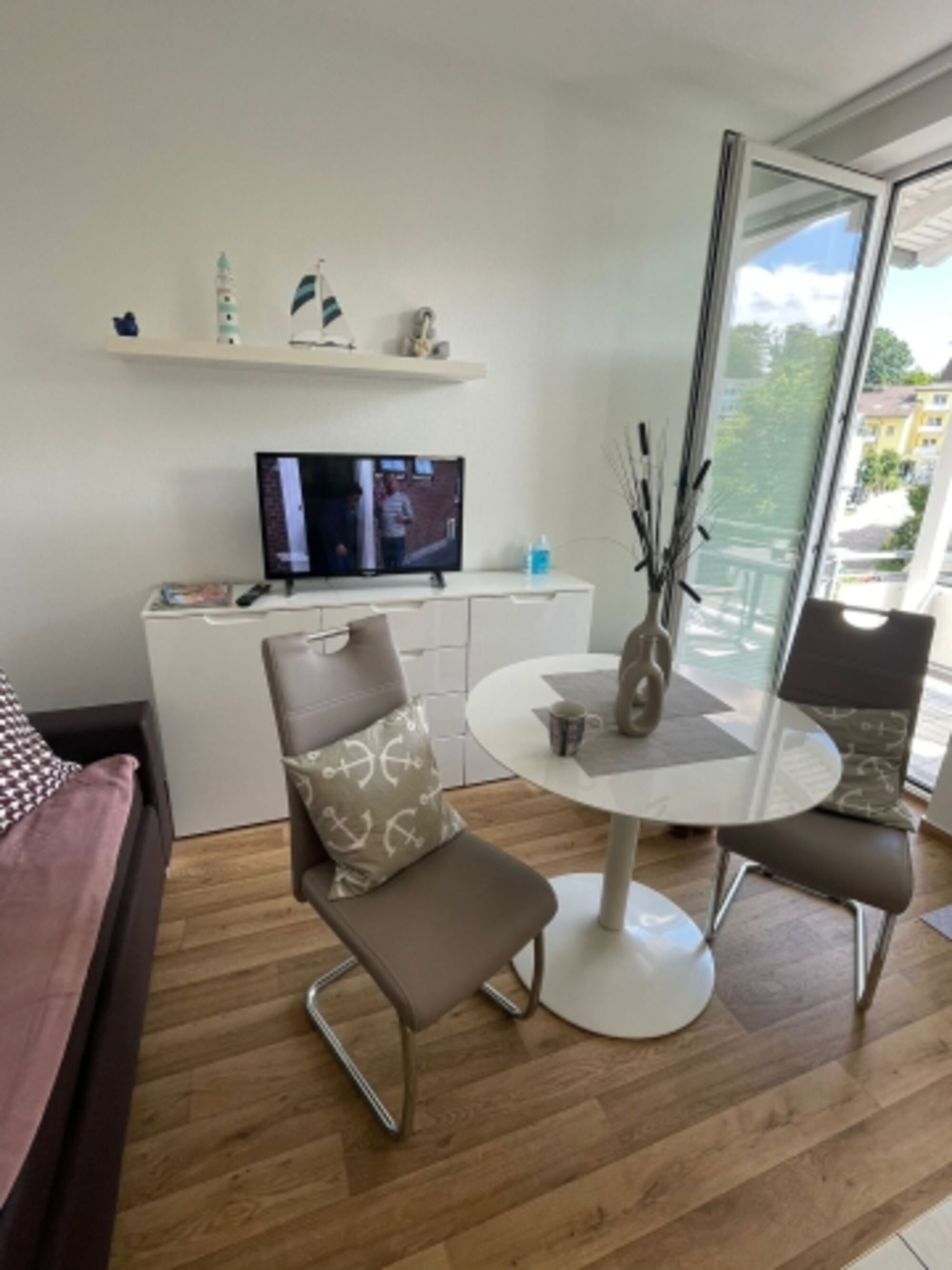 Die Ferienunterkunft in Göhren ist eine gemütliche Ferienwohnung im Stadtzentrum, nur 80 m vom Nordstrand entfernt. Sie verfügt über ein Schlafzimmer mit Doppelbett und Emma-Matratzen, ein Tageslichtbadezimmer mit Dusche sowie einen Wohn-/Küchenraum mit einer voll ausgestatteten Küchenzeile. Ein Esstisch steht zur Verfügung, und für Frühstück und Kaffee gibt es ein Café direkt gegenüber. Die Ferienwohnung bietet außerdem eine moderne Schlafcouch, einen Flachbildfernseher, kostenloses WLAN und Netflix. Vom Balkon mit Tisch und Stühlen genießen Sie den Blick auf Göhren und das Rauschen der Ostsee. Die Ferienwohnung im 2. Obergeschoss ist bequem per Aufzug erreichbar und verfügt über einen eigenen Stellplatz vor der Haustür. ??️