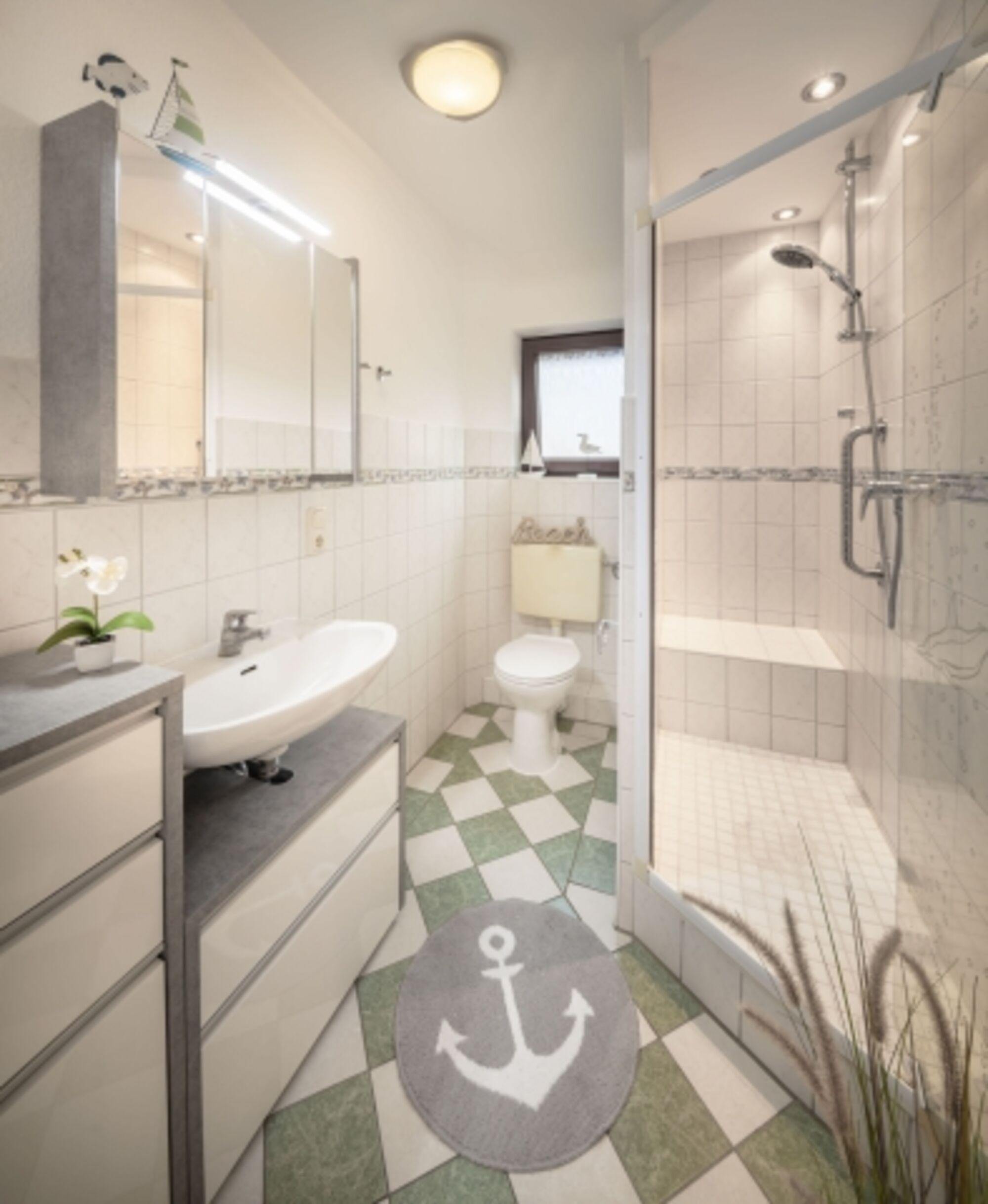 Das Duschbad ist ausgestattet mit einer großen Dusche mit Sitzgelegenheit und Glastüren, einem Eizelwaschbecken und Toilette. Sie mögen es mit Wellenrauschen einzuschlafen? Dann sind Sie im großen, zum Meer hin ausgerichteten, Schlafzimmer genau richtig. Dieses Zimmer ist mit einem Doppelbett ausgestattet. Selbstverständlich finden Sie auch hier einen Fernseher vor. Auch das zweite Schlafzimmer ist mit einem Fernseher ausgetattet und bietet Ihnen zwei Einzelbetten.