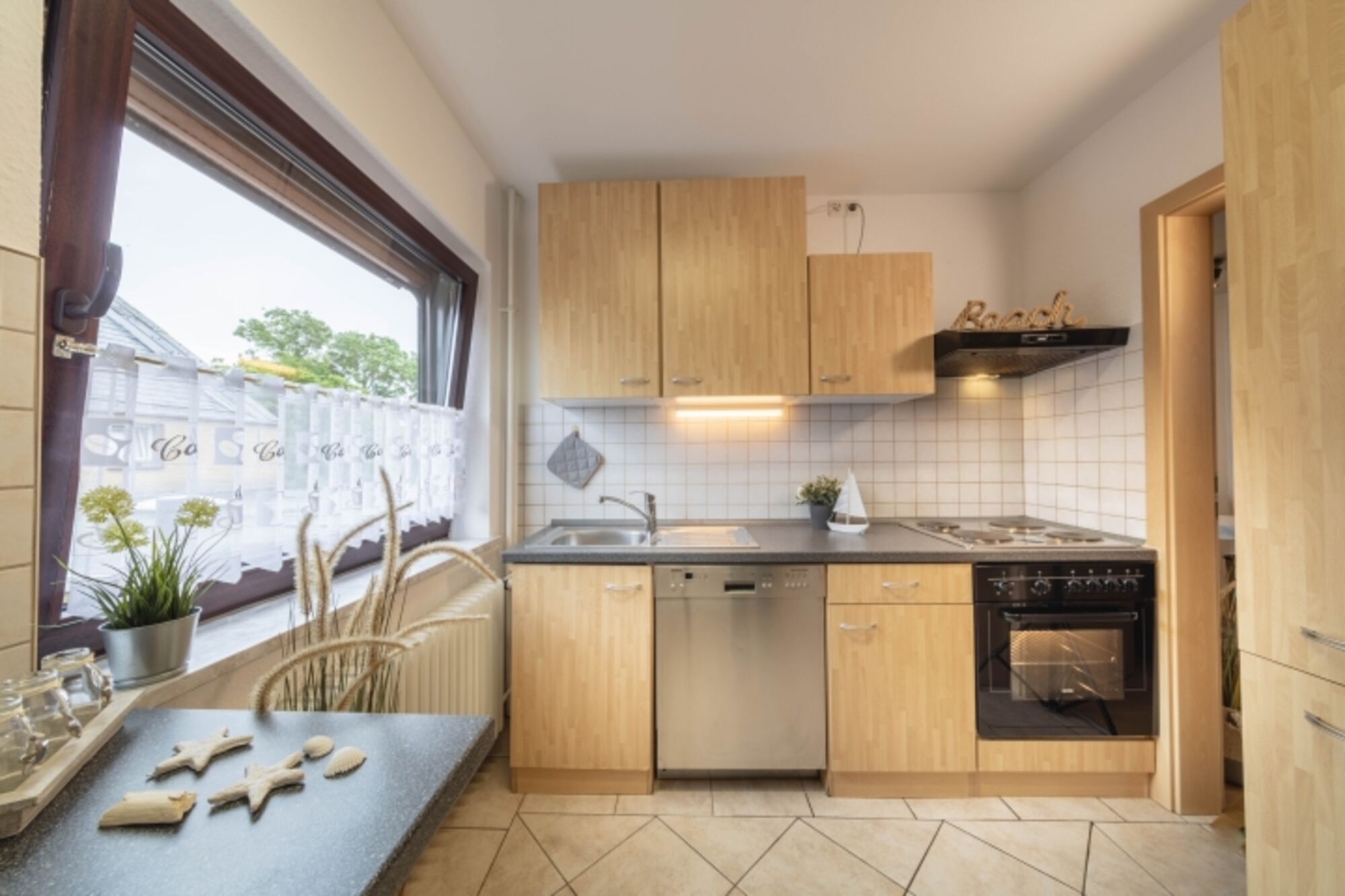 Es erwartet Sie eine ruhige Ferienwohnung mit einer Essecke für 4 Personen im Wohnzimmer. Zum Ausruhen nach dem Strandtag lädt das bequeme und sehr große Sofa ein, von hier läßt es sich wunderbar fernsehen. Die Küche ist voll ausgestattet damit Sie sich im Urlaub selbst versorgen können. Mikrowelle, 4-Platten Herd, Backofen, Kühlschrank mit Gefrierfach, Geschirrspülaschine, Handrührgerät, Kaffeemaschine, Toaster und Wasserkocher sind für uns selbstverständliche Utensilien in der Küche.