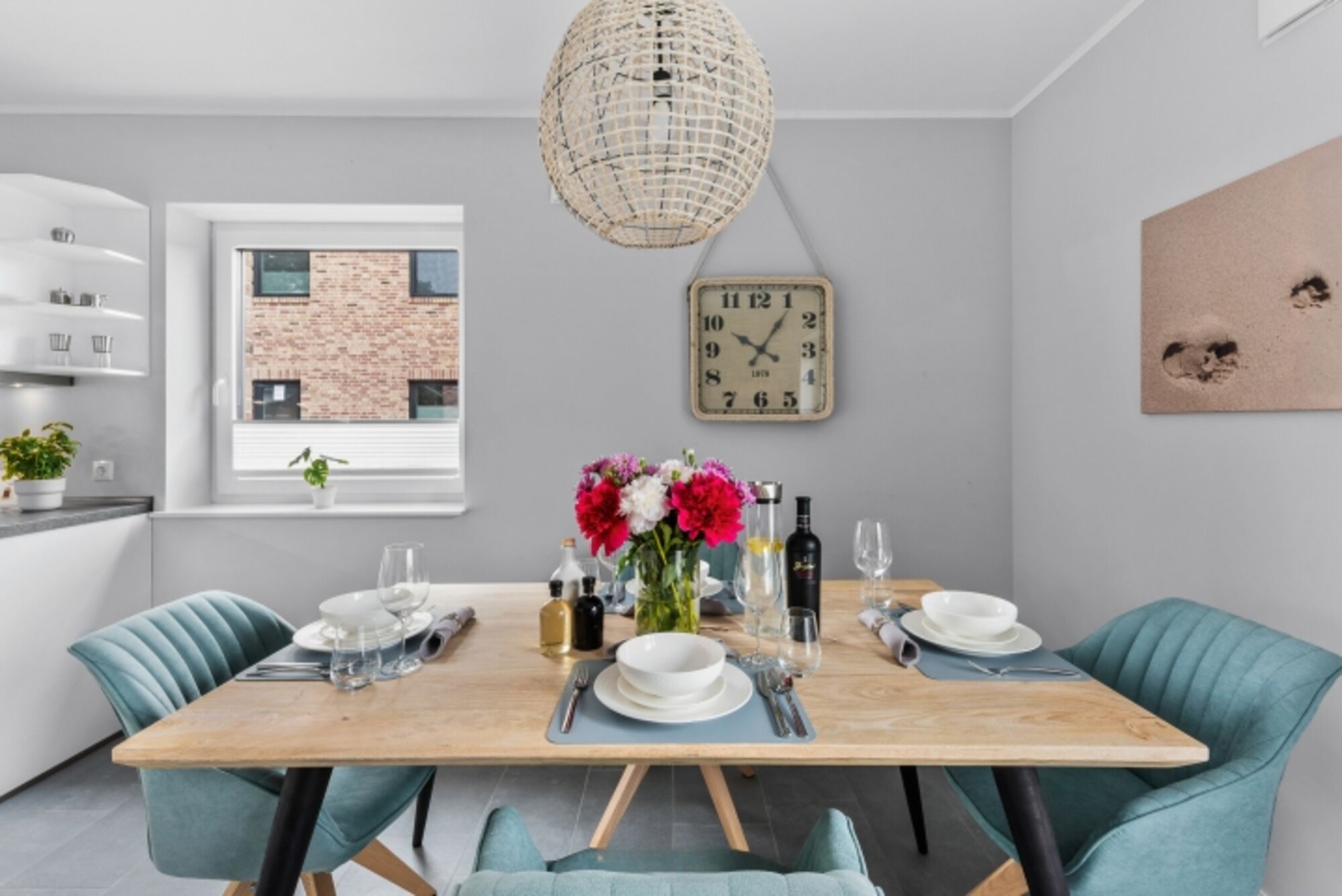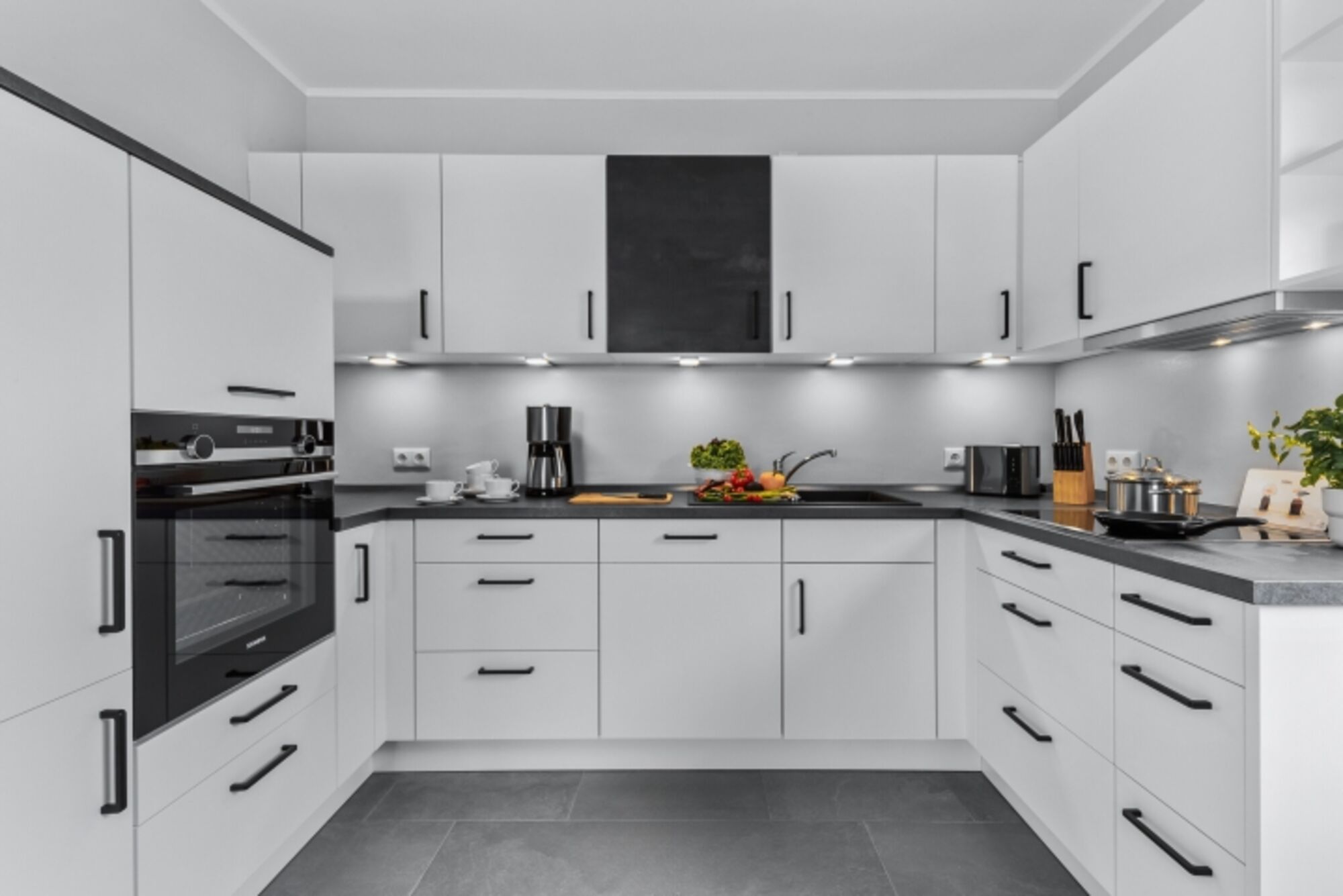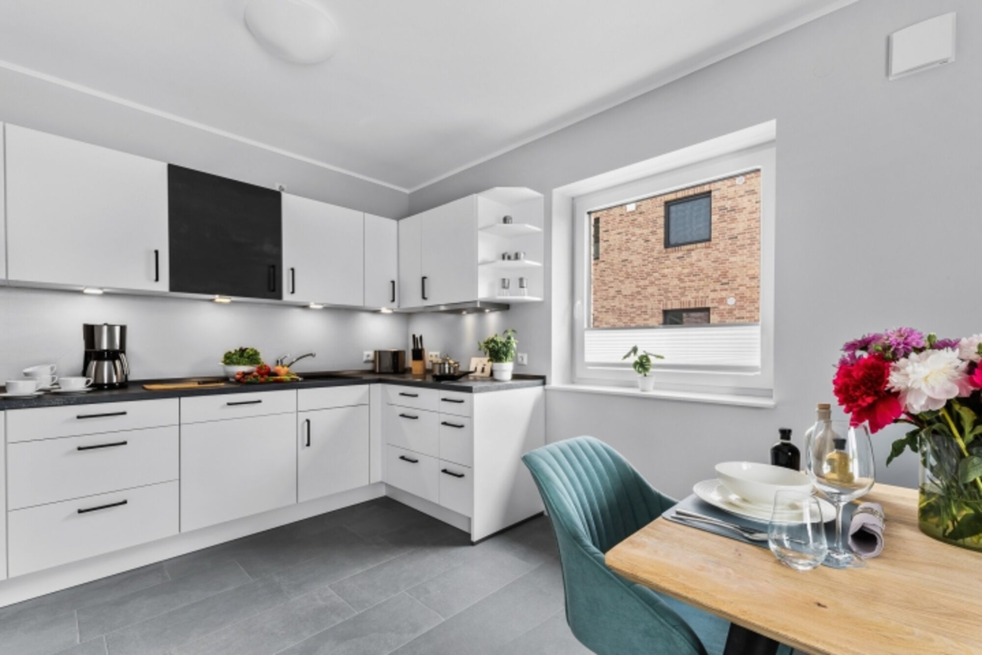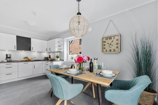 Cerankochfeld, Dunstabzugshaube, Gefrierschrank, Korkenzieher / Flaschenöffner, Geschirrhandtücher, Mülltüten, Essplatz in der Küche