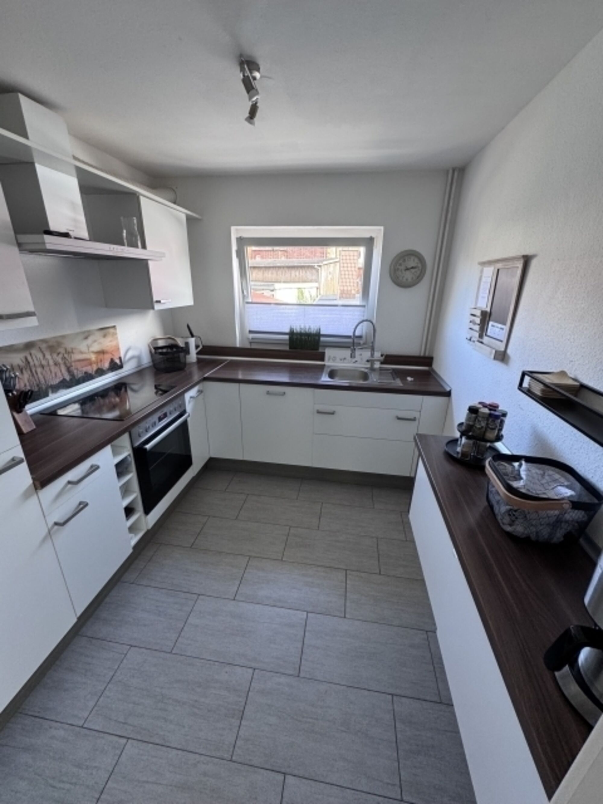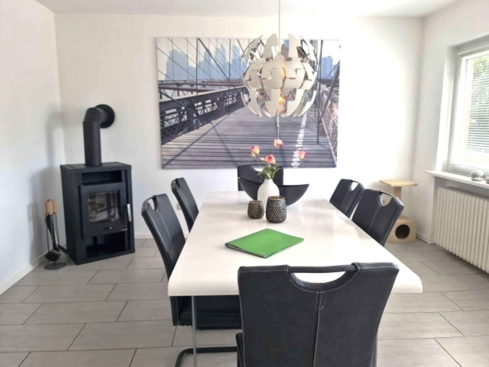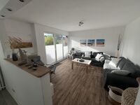 Die Küche ist modern und voll ausgestattet. Im Essbereich, der durch eine halbhohe Wand mit dem Wohnzimmer integriert ist, finden 6-8 Personen am großen Esstisch Platz. Die Sofaecke im Wohnzimmer bietet genügend Platz für entspannte Momente.