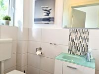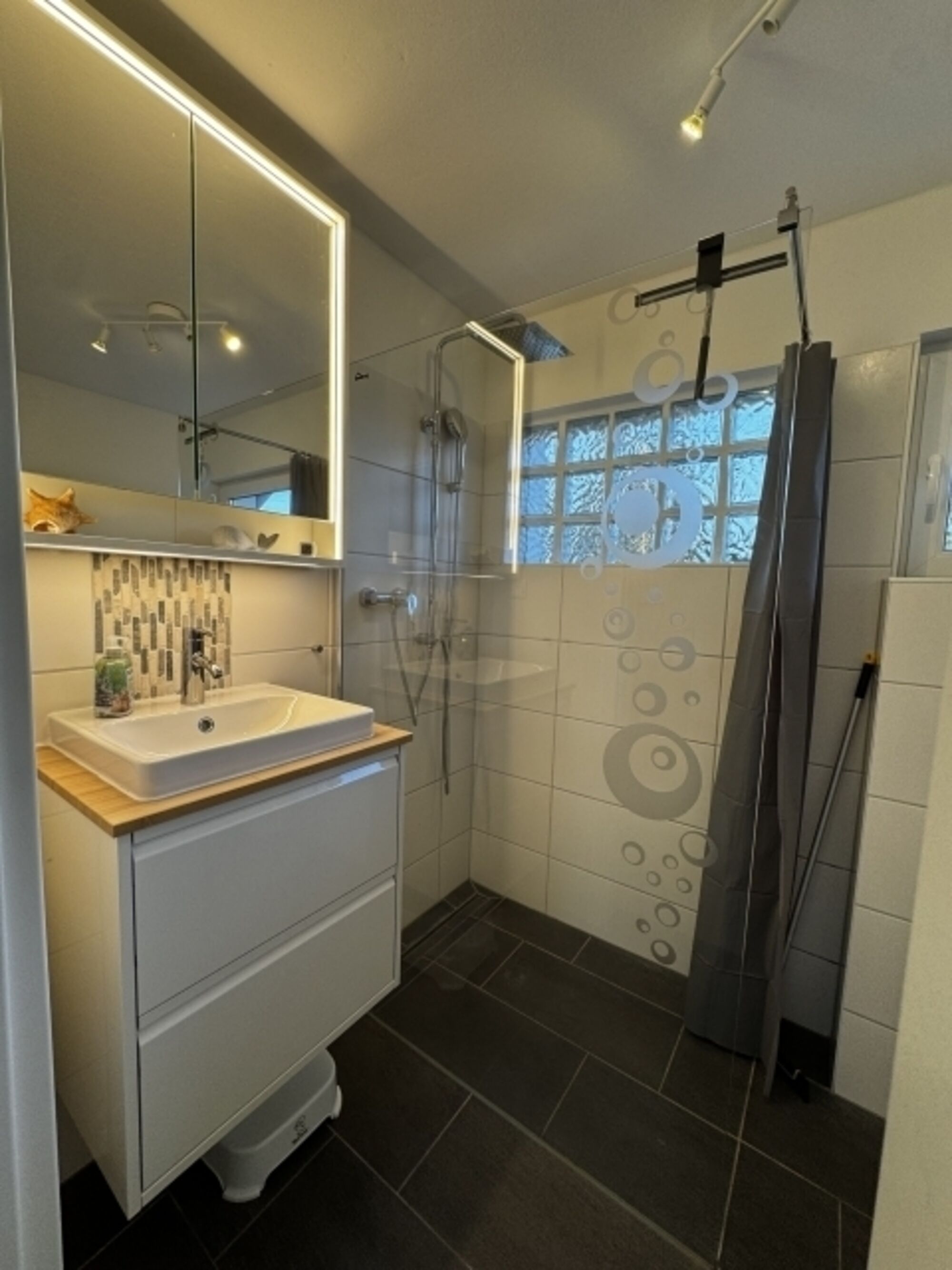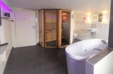 Im Souterrain des Strandhauses, neben dem Hauswirtschaftsraum mit Gefrierschrank, Waschmaschine und Trockner, befindet sich auch der Bereich für Wellness und Entertainment. Dieser bietet eine Glassauna, eine geräumige Walk-In Dusche und eine Whirlpool-Badewanne, zudem ist er mit einem Fernseher ausgestattet.
