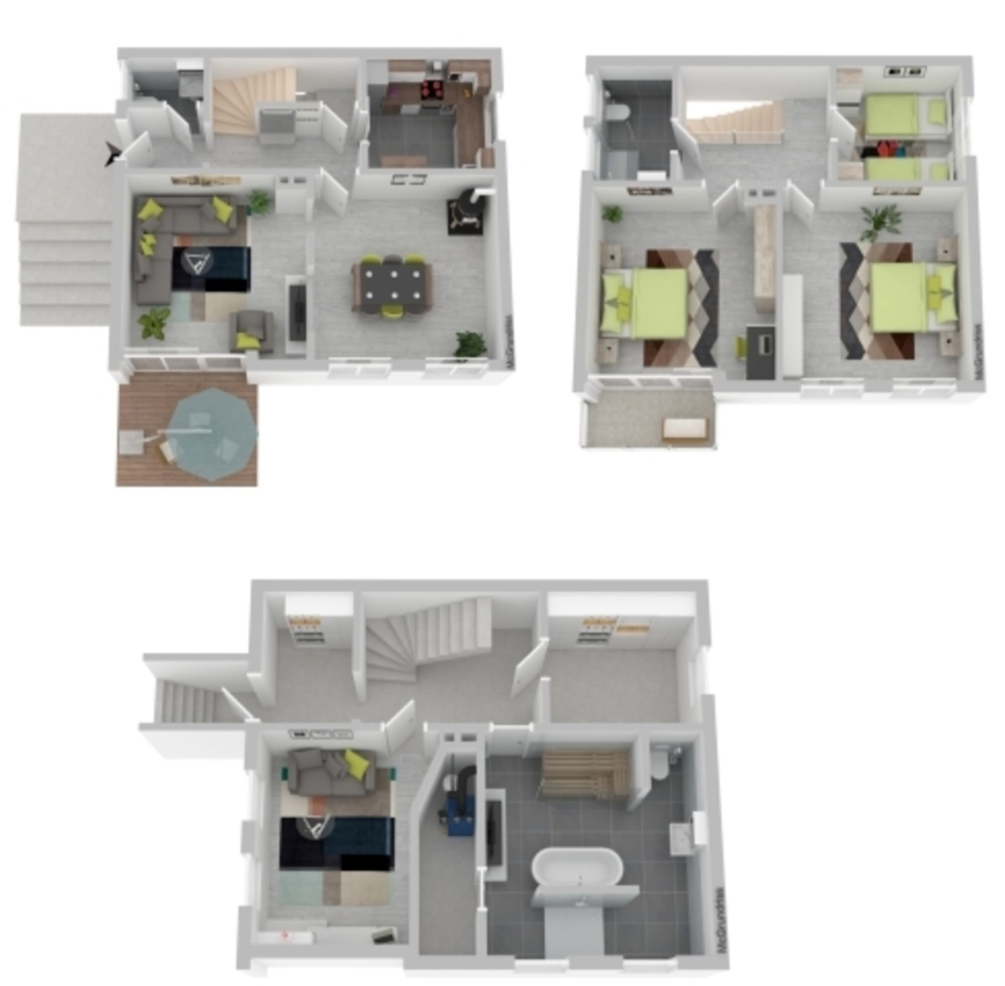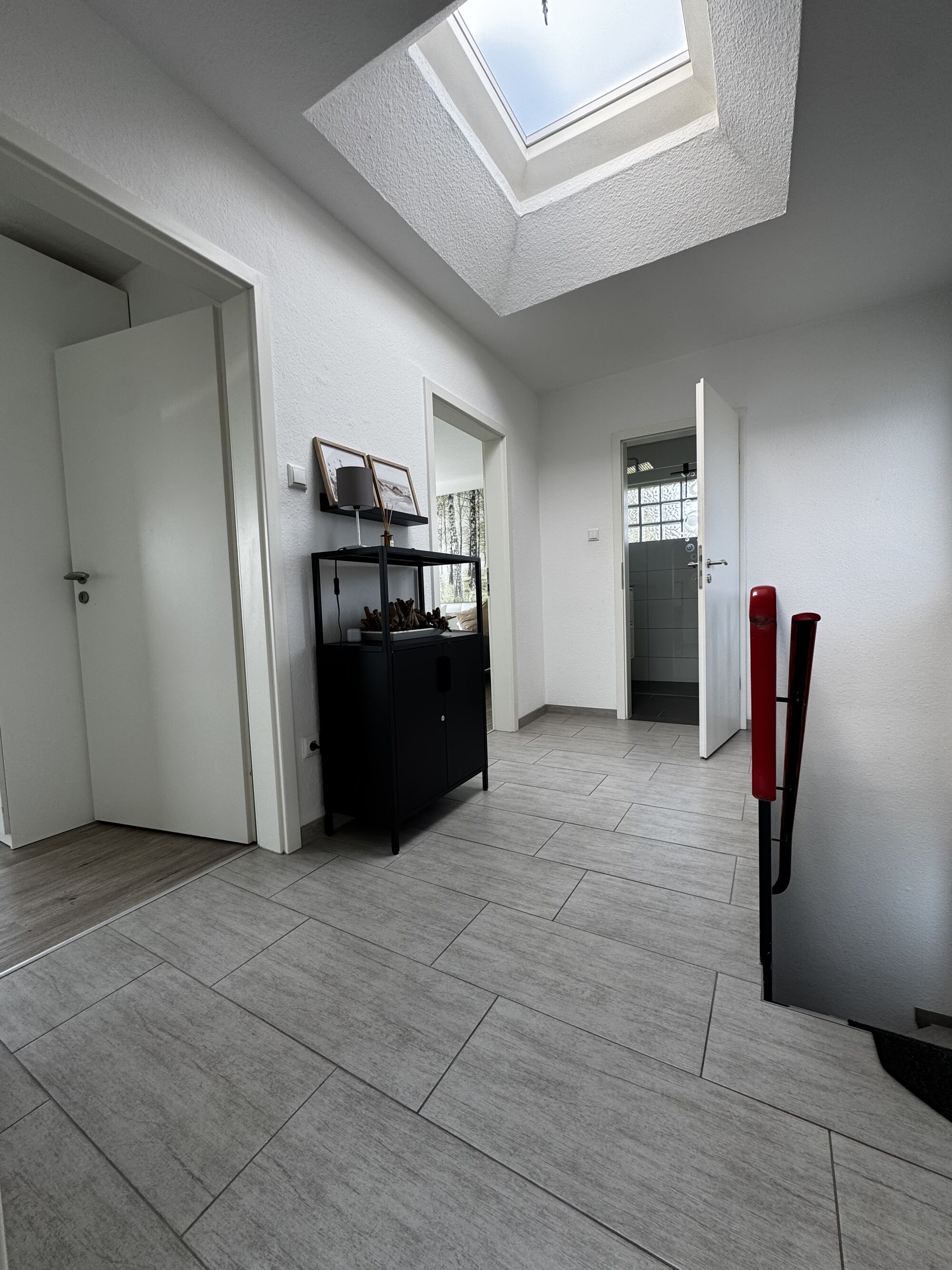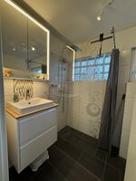 Im Obergeschoss befinden sich drei Schlafzimmer. Zwei davon sind mit Doppelbetten und Fernsehern ausgestattet, das dritte bietet zwei Einzelbetten. Eines der Schlafzimmer ermöglicht den Zugang zu einem Balkon und verfügt über eine kleine Arbeitsecke. Das Duschbad auf dieser Etage ist mit einer geräumigen Walk-In-Dusche, einem modernen Waschtisch und einer Toilette ausgestattet.