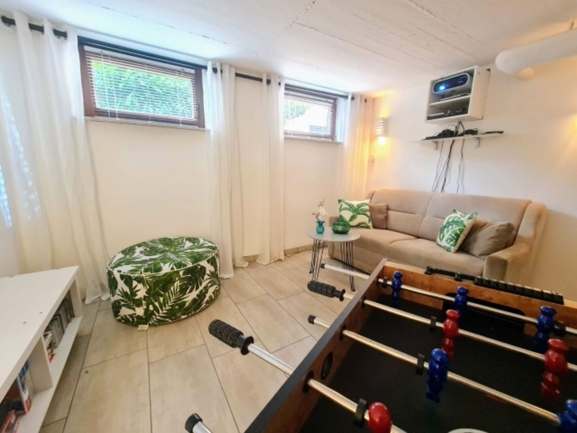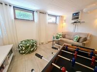Direkt angrenzend liegt der Entertainmentbereich. Dieser ist mit einer Leinwand, einem Projektor, TV-Anschluss, DVD-Player und einer Spielkonsole ausgestattet und bietet somit eine ideale Freizeitbeschäftigung für regnerische Tage. Die Couch lässt sich bei Bedarf in ein zusätzliches Bett umwandeln, wodurch sich Schlafgelegenheiten für bis zu acht Personen in unserem Strandhaus bieten.