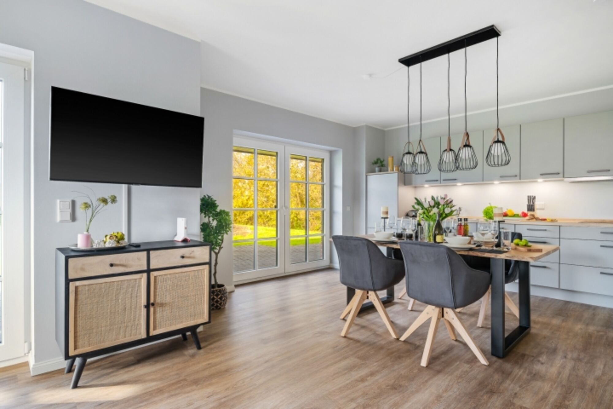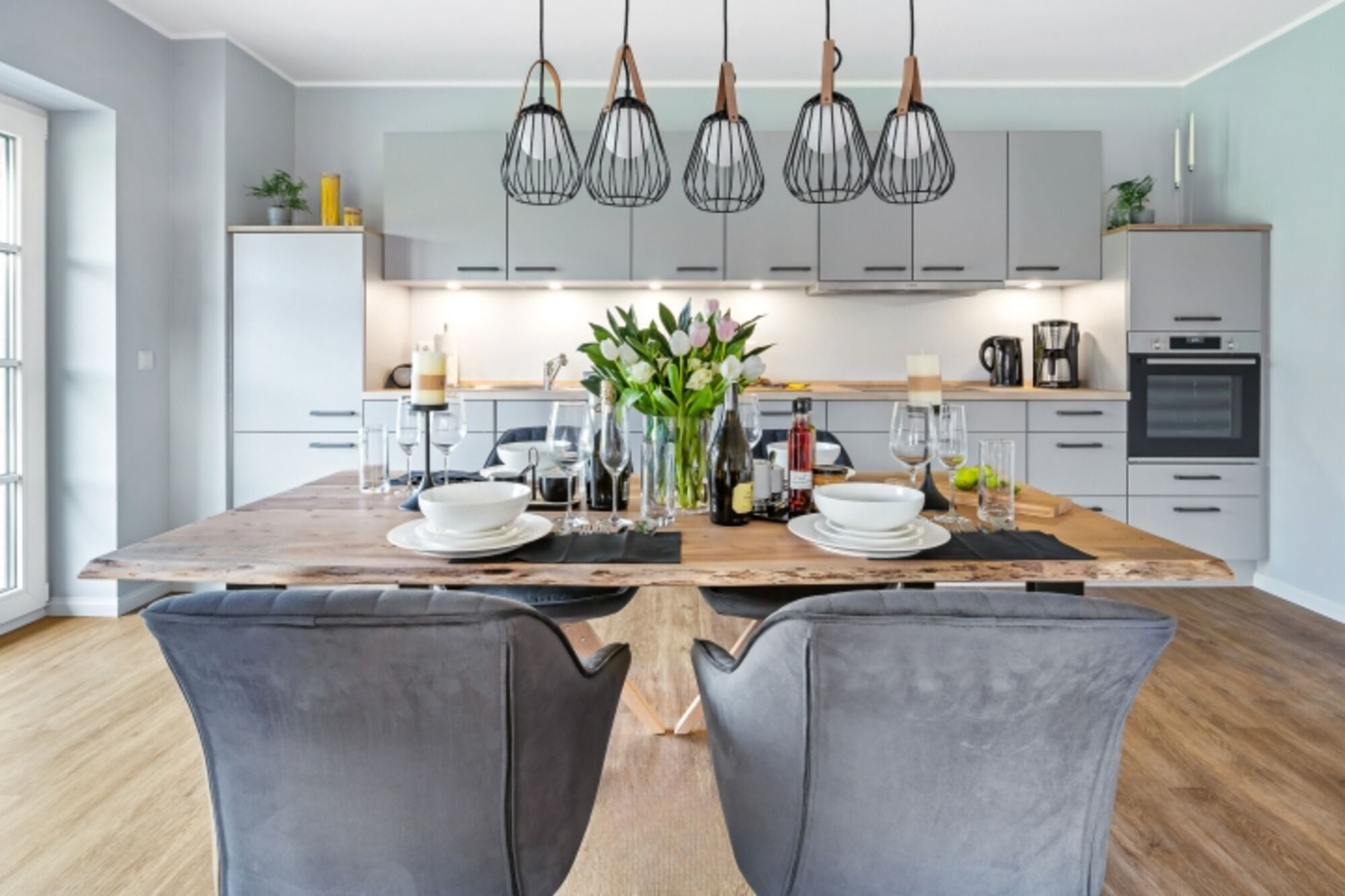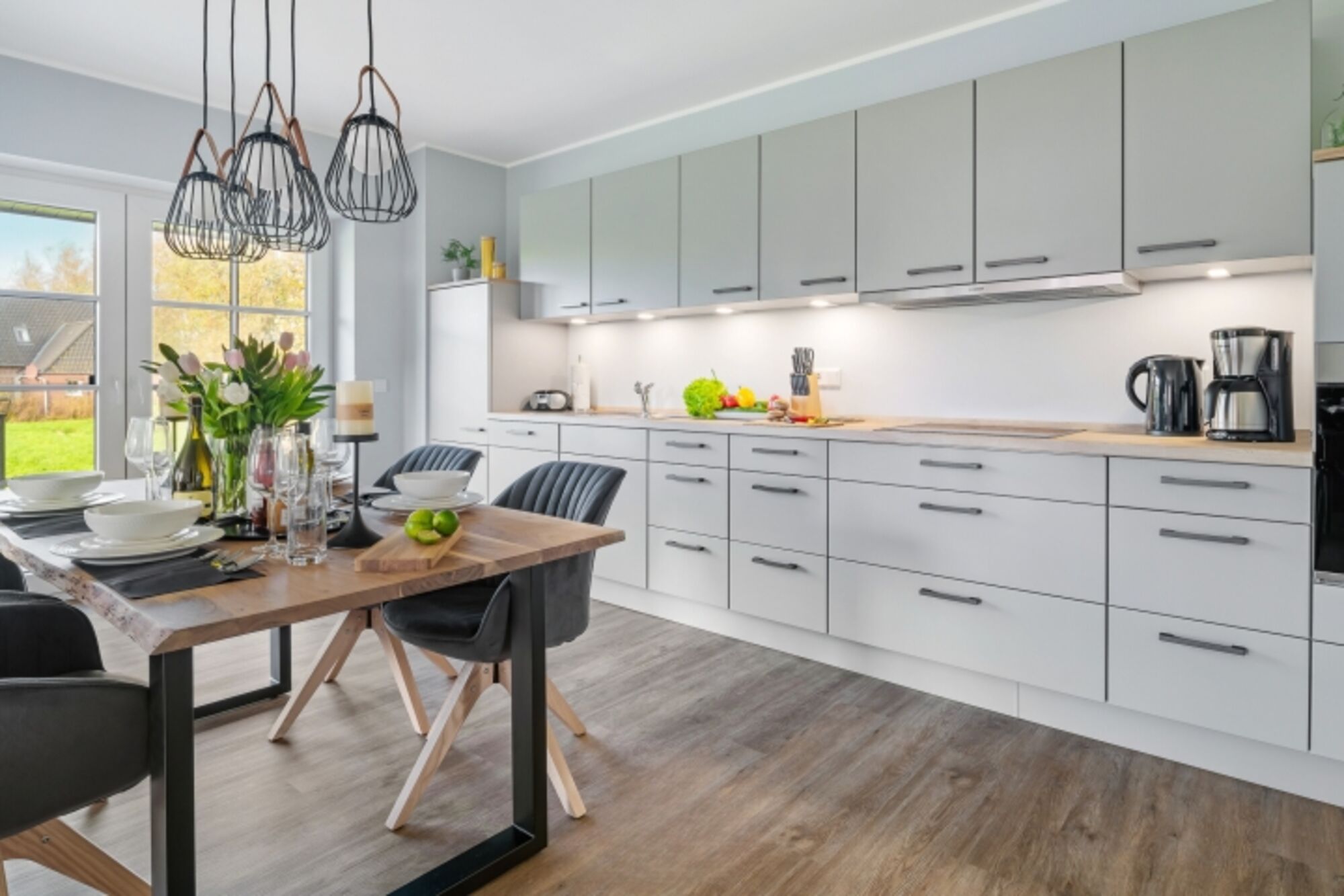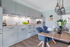 Cerankochfeld, Dunstabzugshaube, Gefrierschrank, Mixer, Gewürze (Salz, Pfeffer, Zucker), Geschirrhandtücher, Mülltüten, Essplatz in der Küche
