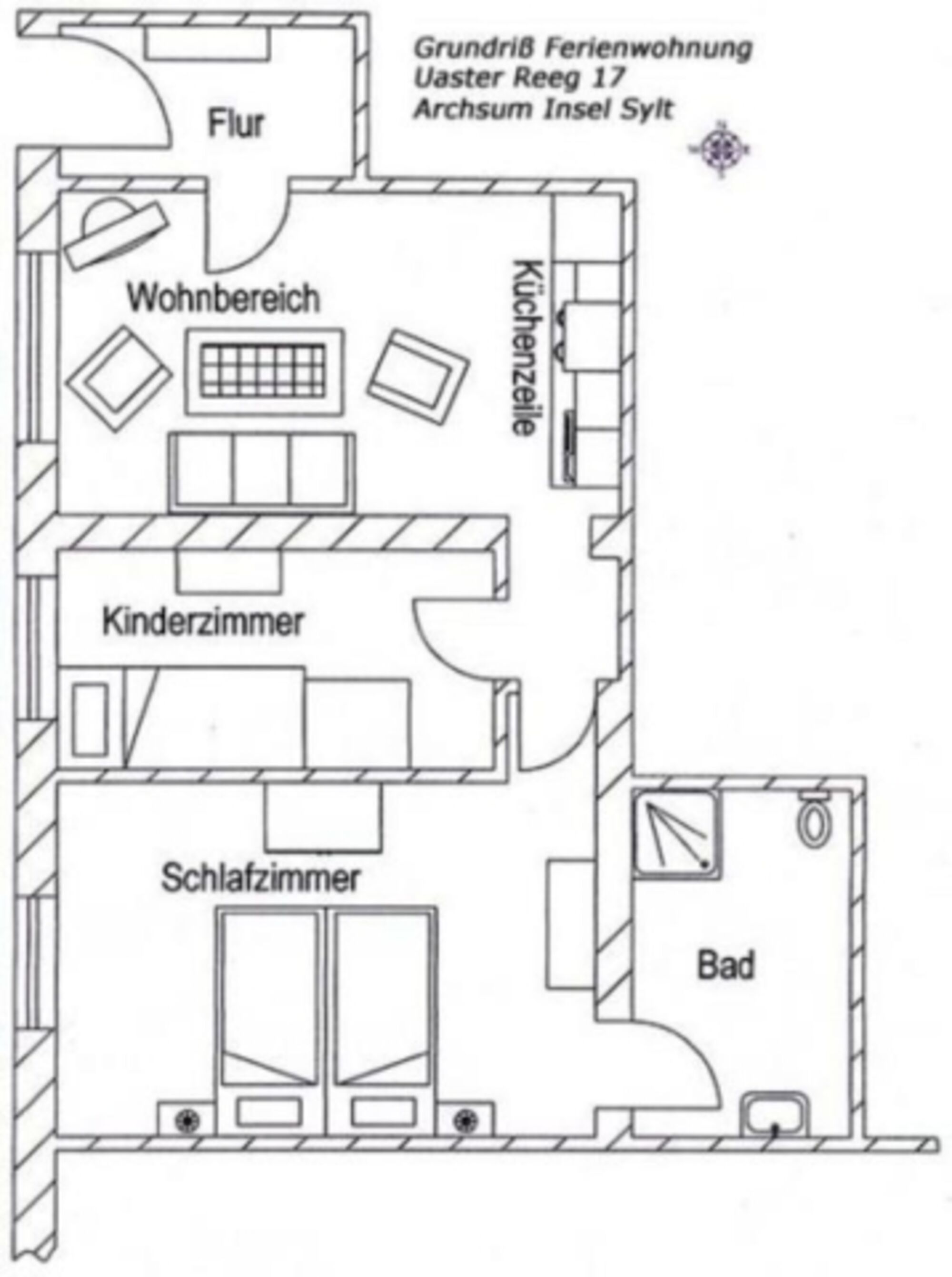 Die Ferienwohnung hat eine Größe von ca. 45 qm, besteht aus einem Flur, einem Wohn- und Küchenbereich, einem Schlafraum mit einem Bett, einem Schlafraum mit einem Doppelbett und einem Duschbad.