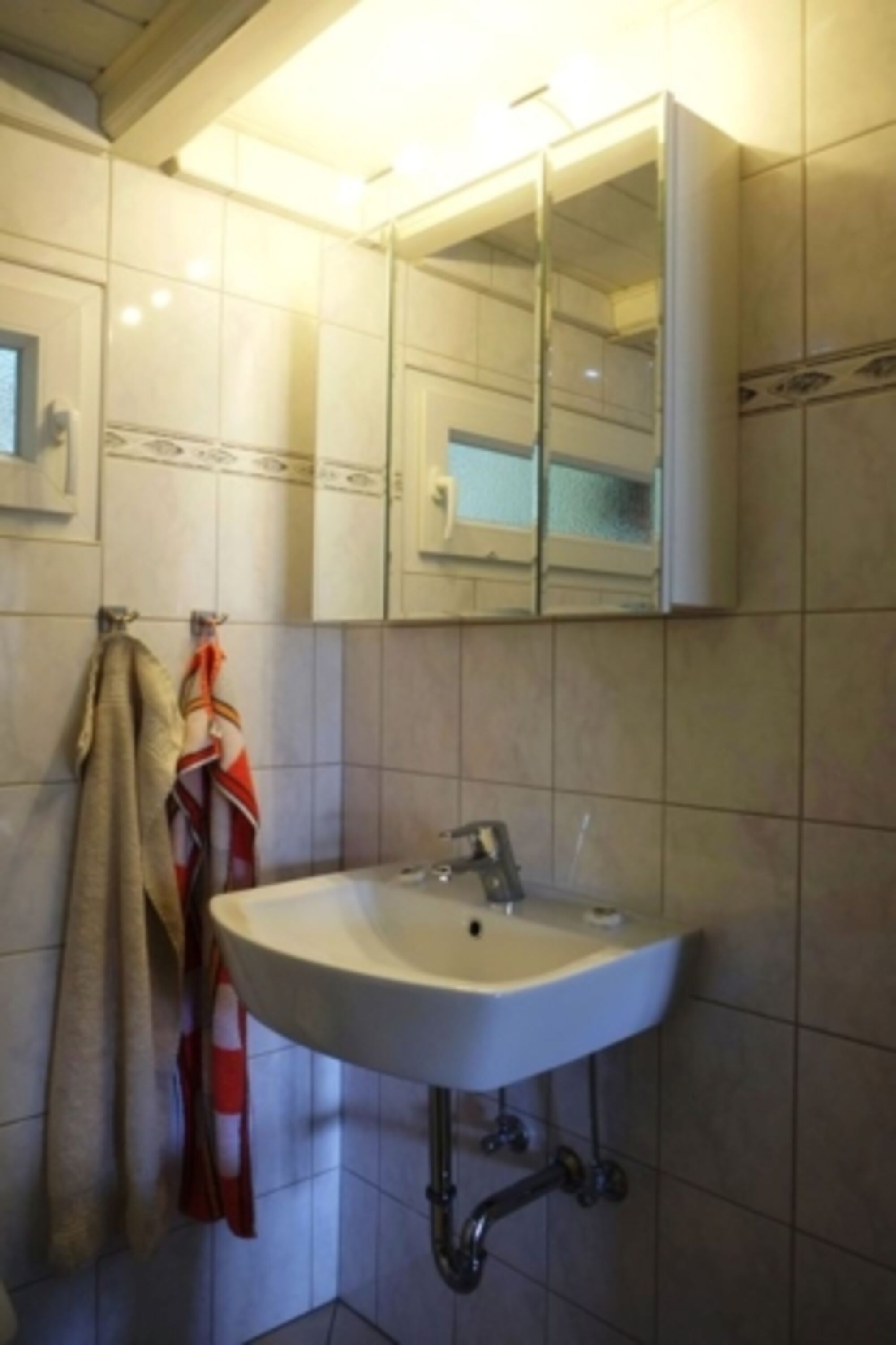 Das im Jahr 2011 erneuerte Bad hat einen geräumigen ebenerdigen Duschbereich, eine Toilette und 1 Waschbecken, die Belüftung erfolgt über ein Außenfenster.