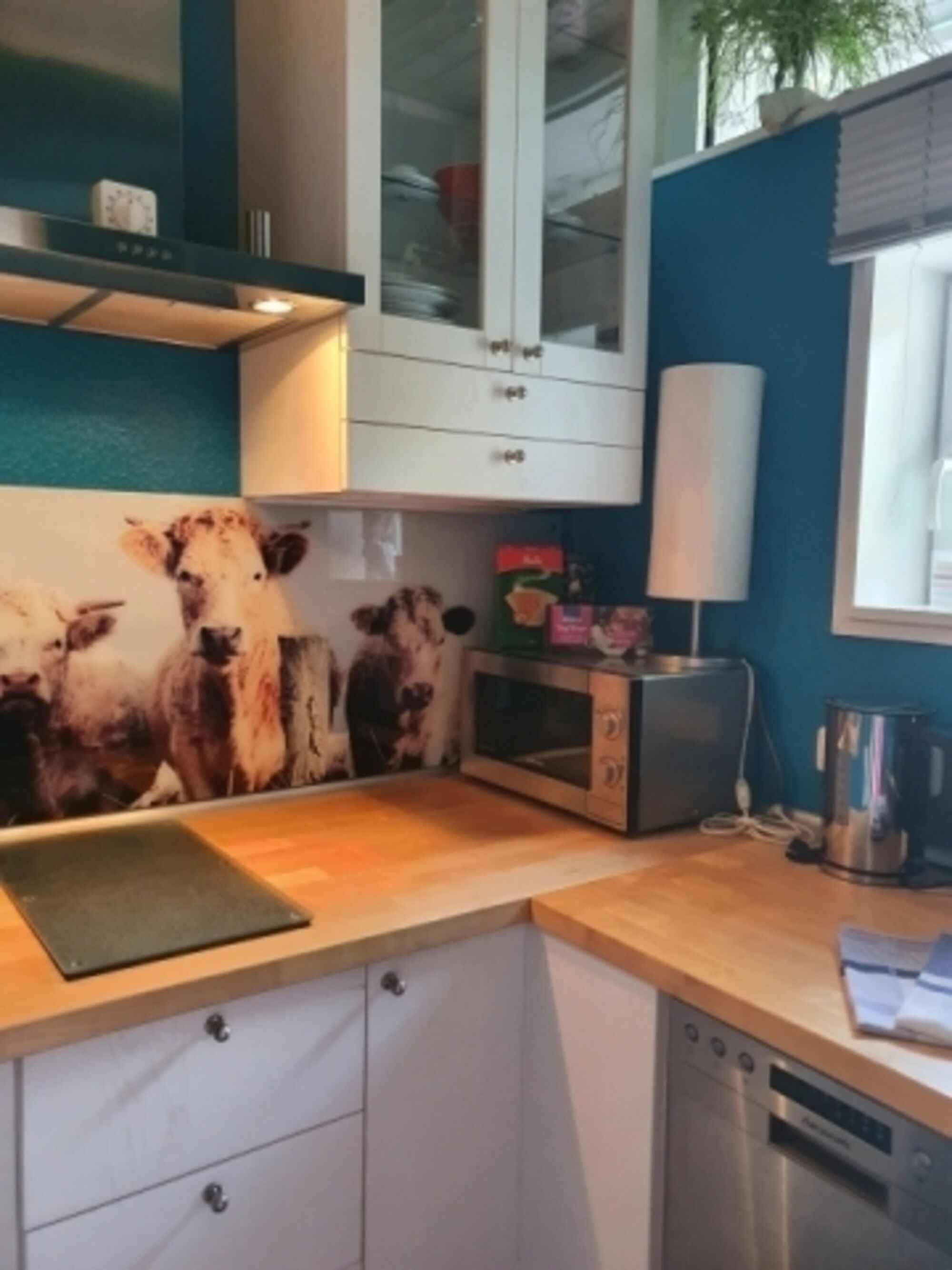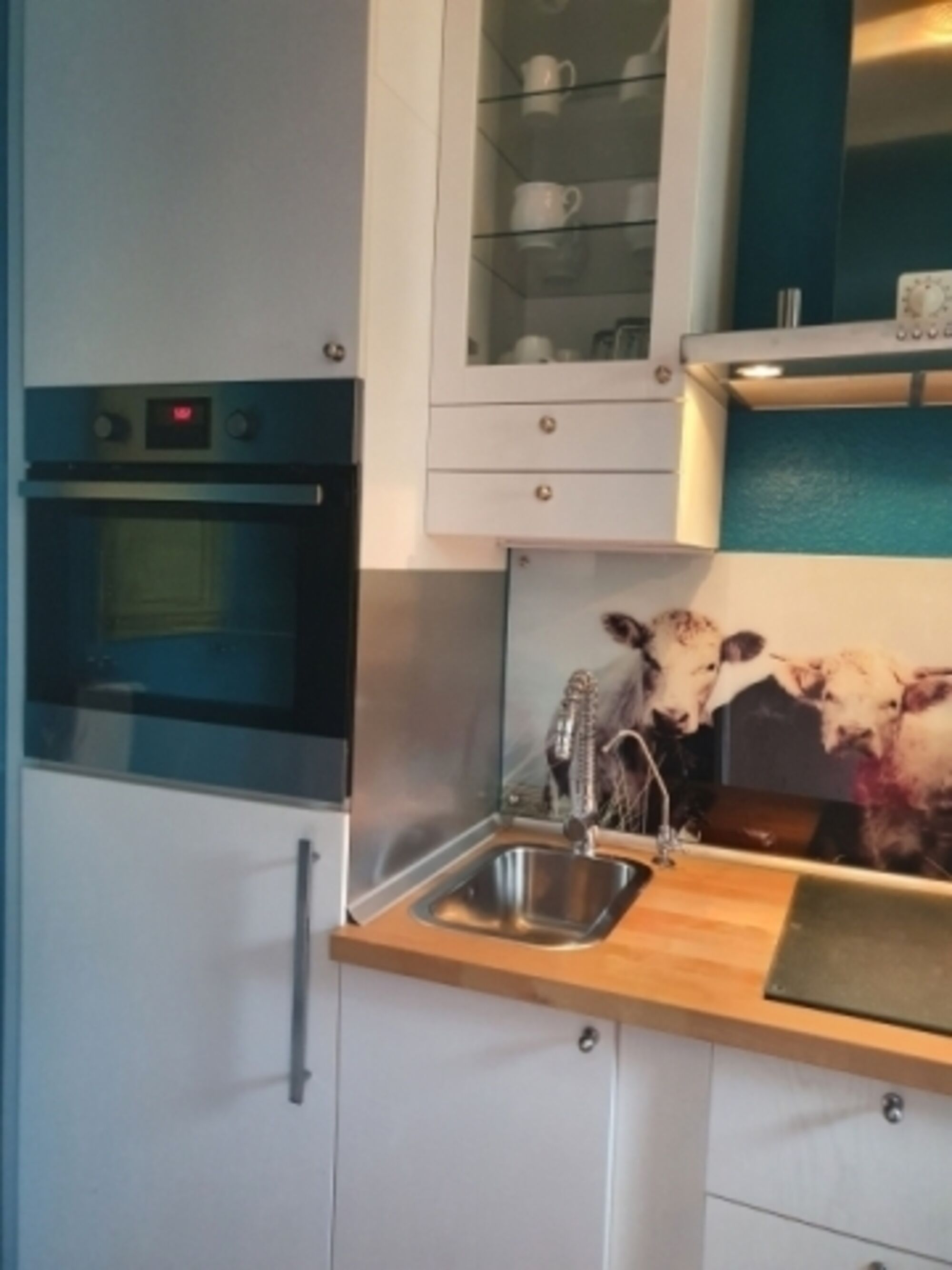 2-Platten Herd, Cerankochfeld, Dunstabzugshaube, Gefrierschrank, Korkenzieher / Flaschenöffner, Geschirrhandtücher, Mülltüten