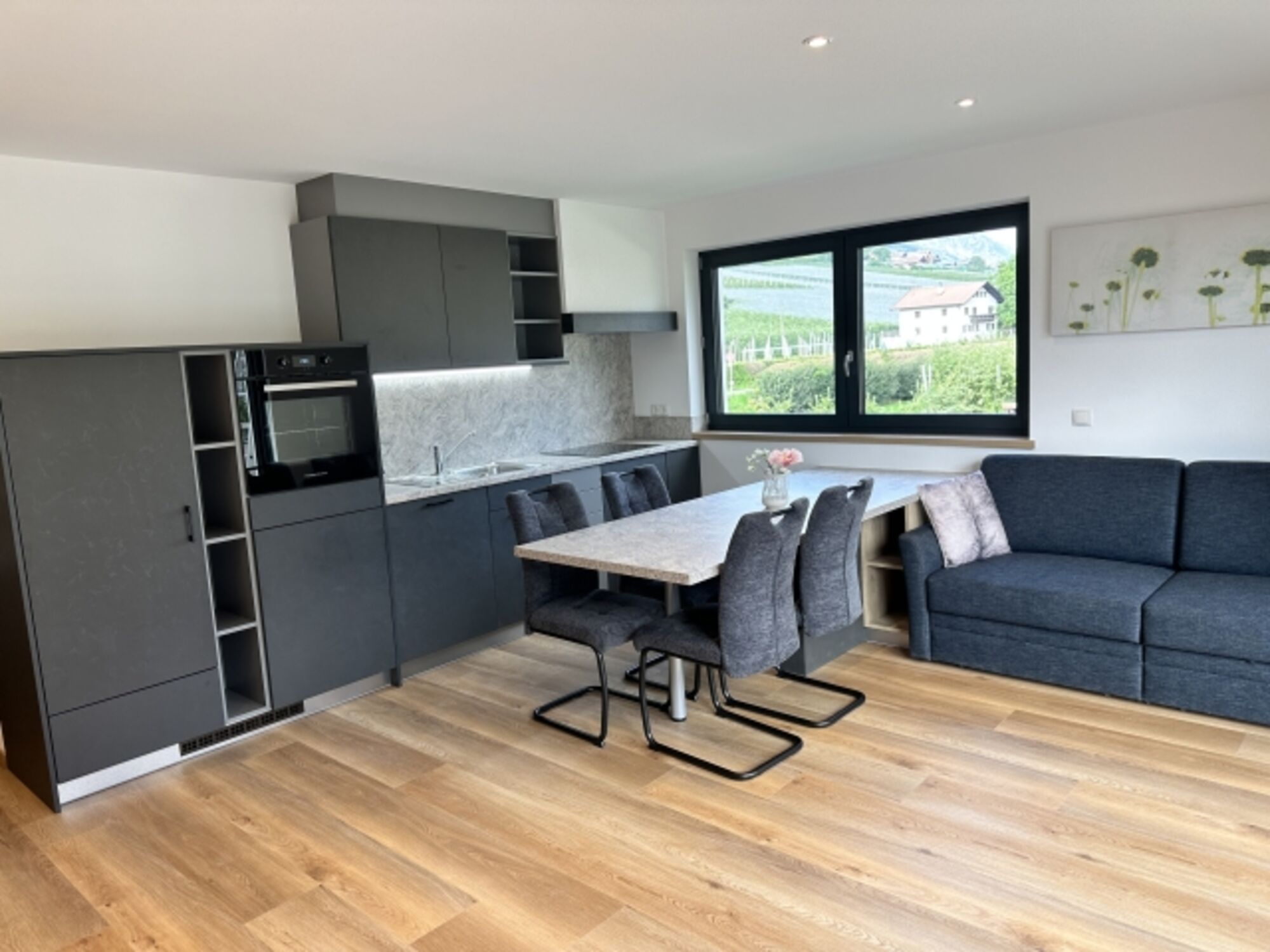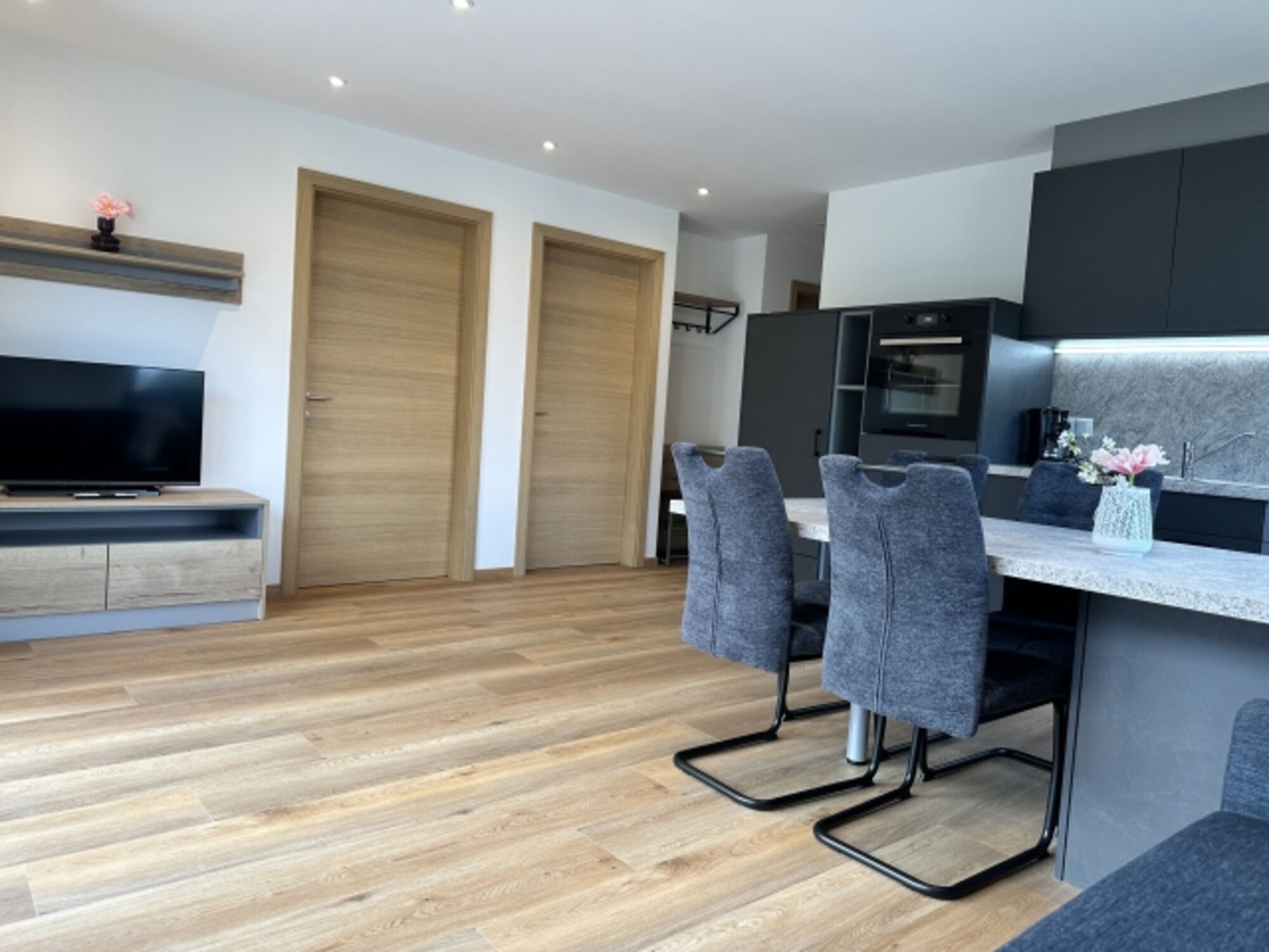 Die voll ausgestattete, moderne Küche lädt dazu ein, gemeinsam köstliche Mahlzeiten zuzubereiten. Von hochwertigen Geräten bis hin zu allen nötigen Utensilien und Geschirr – hier fehlt es an nichts. Der offene Wohn- und Essbereich schafft eine angenehme Atmosphäre für entspannte Familienmomente. Ob auf dem bequemen Sofa oder am stilvollen Esstisch, hier können Sie zusammen essen, spielen und genießen.