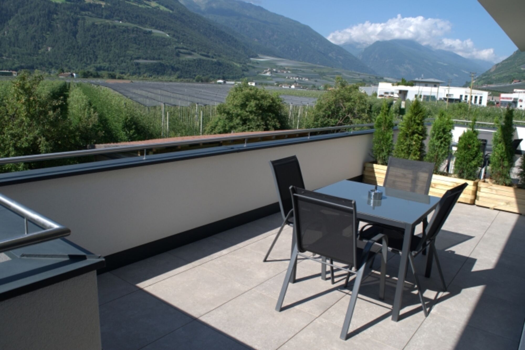 Das absolute Highlight ist die wunderschöne Sonnenterrasse. Genießen Sie den herrlichen Blick auf die angrenzende Wiese, entspannen Sie bei einem guten Buch oder lassen Sie den Tag mit einem Glas Wein ausklingen.